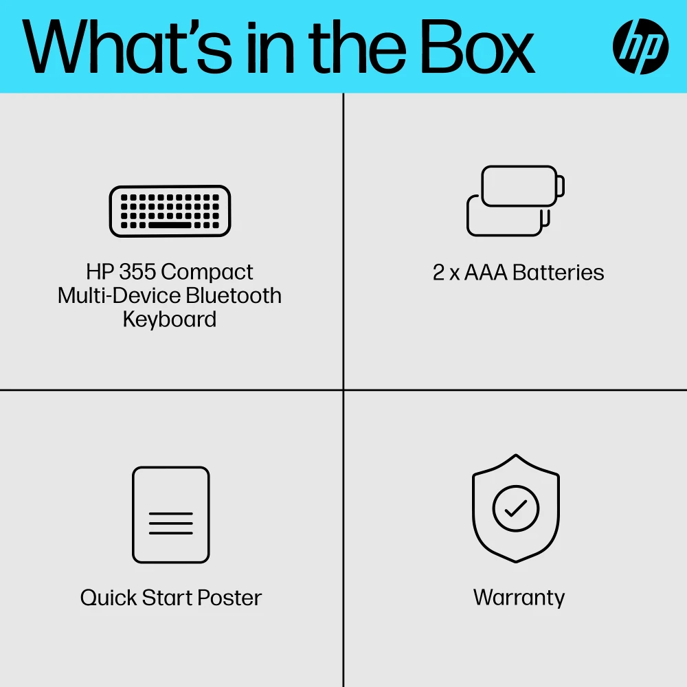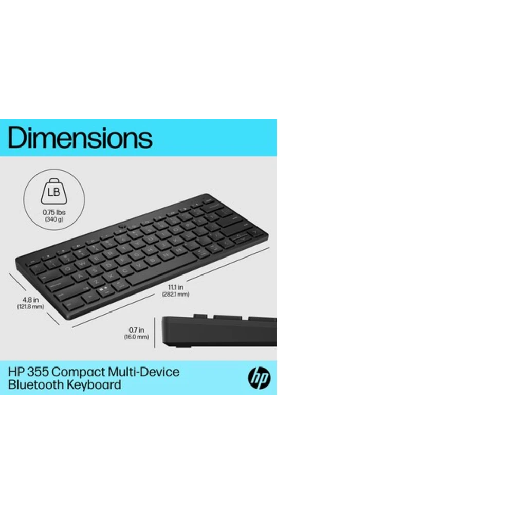355 Compact Multi-Device Bluetooth Keyboard HP 355 Compact Multi-Device Bluetooth Keyboard. Connectivity technology: Wireless, Device interface: Bluetooth, Keyboard key switch: Mechanical, Recommended usage: Home. Product colour: Black Just Your Type: Compact, Comfortable, Connected