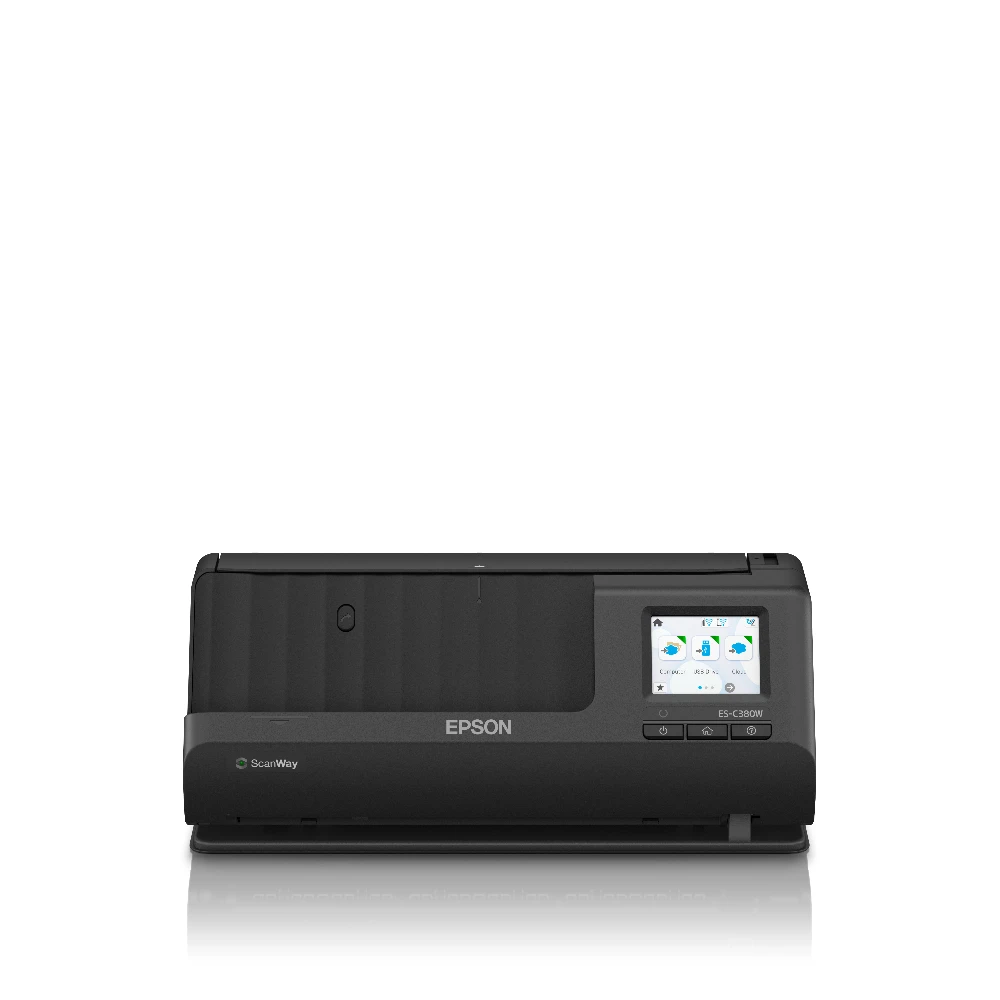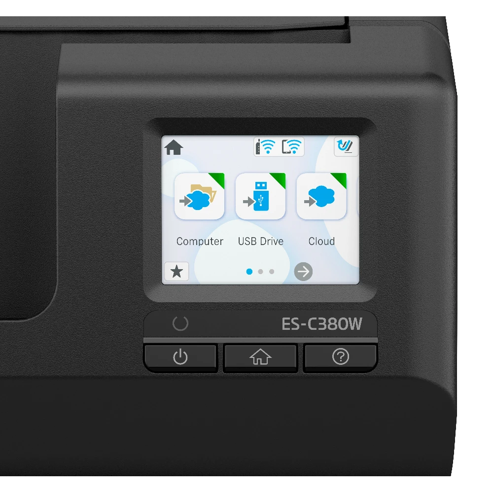 ES-C380W Epson ES-C380W. Maximum scan size: 215.9 x 5588 mm, Optical scanning resolution: 600 x 600 DPI, Input colour depth: 30 bit. Scanner type: ADF + Sheet-fed scanner, Product colour: Black, Control type: Buttons. Daily duty cycle (max): 3500 pages, Light source: ReadyScan LED, Scan to: E-mail, FTP, Network folder, Print. Standard input capacity: 20 sheets. Maximum ISO A-series paper size: A4, Scanning media types supported: Business Card, Plastic Card, Post Card(JPN), ISO A-series sizes (A0...A9): A4, A5, A6 Compact network scanner