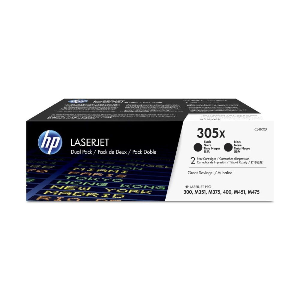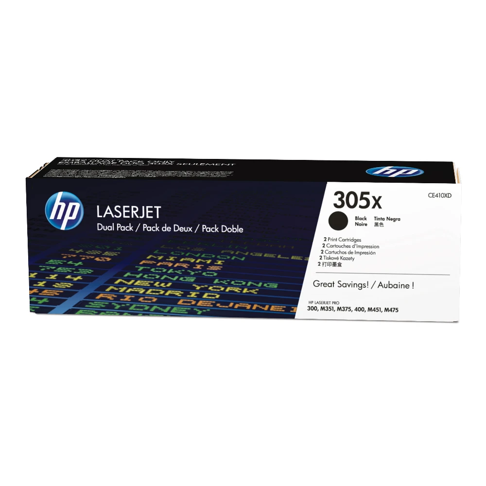 HP 305X Dual Pack LaserJet Toner Cartridges deliver professional print quality for a better value than individual cartridges. Print more and save more. Stay productive and reduce downtime by keeping an extra toner cartridge on hand.