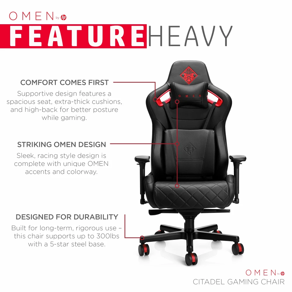 OMEN by Citadel Gaming Chair, 5 wheels, Black Built for gamers, this chair is perfect for marathon gaming sessions. With a comfortable design and racing-style aesthetic ? enjoy lasting relaxation while you play.