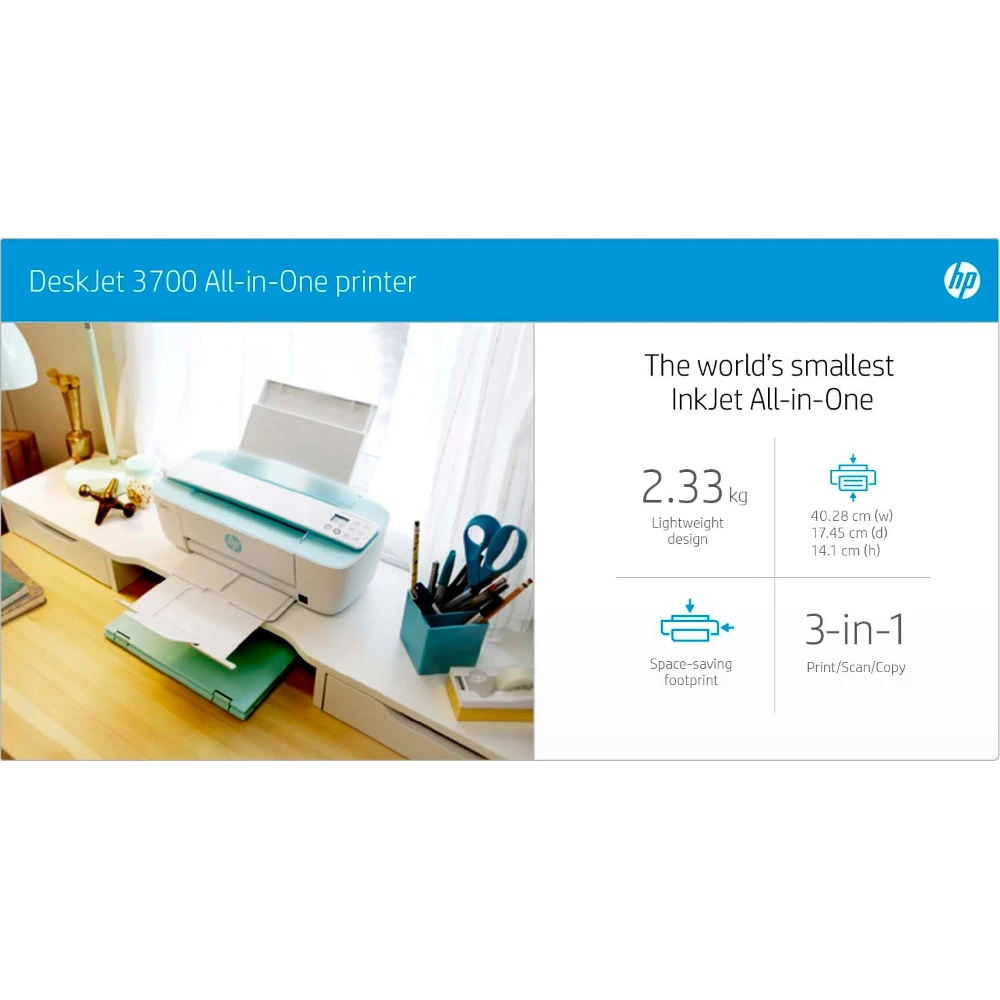 DeskJet 3762 All-in-One Printer HP DeskJet 3762 All-in-One Printer. Print technology: Thermal inkjet, Printing: Colour printing, Maximum resolution: 4800 x 1200 DPI, Print speed (colour, normal quality, A4/US Letter): 5.5 ppm. Copying: Colour copying, Maximum copy resolution: 300 x 300 DPI. Scanning: Colour scanning, Optical scanning resolution: 600 x 600 DPI. Maximum ISO A-series paper size: A4. Wi-Fi. Direct printing. Product colour: Green, White Affordable power, mobile printing, and vibrant colour in the world’s smallest all-in-one printer.[2] Get the compact printing power and wireless independence you need to print, scan, and copy from virtually any mobile device.[1] The world’s smallest all-in-one printer[2] is an Instant Ink ready printer that fits and looks good virtually anywhere.