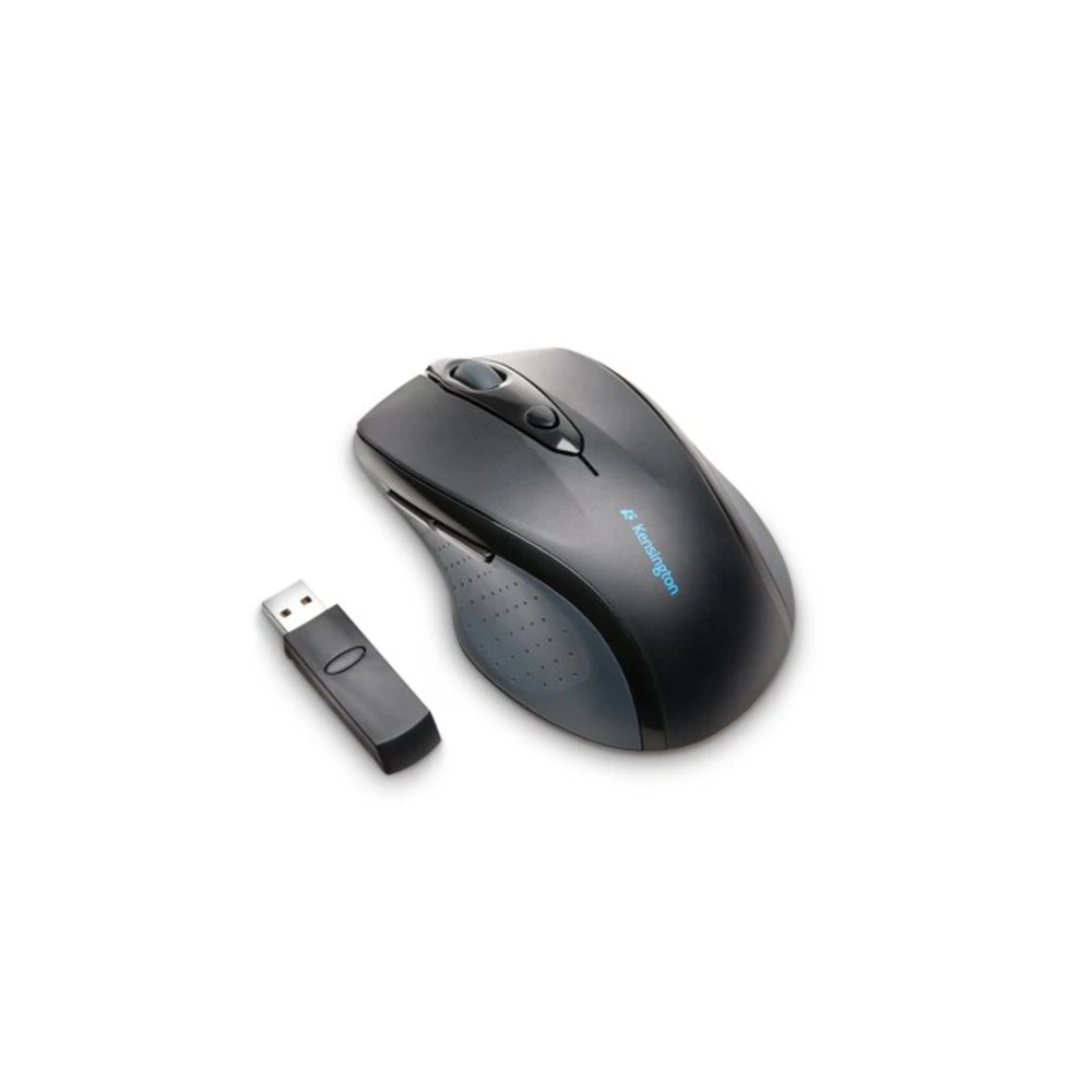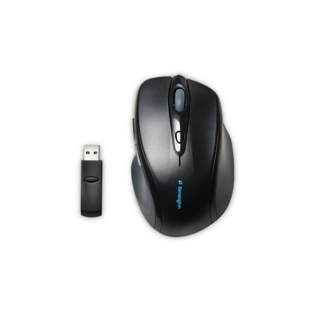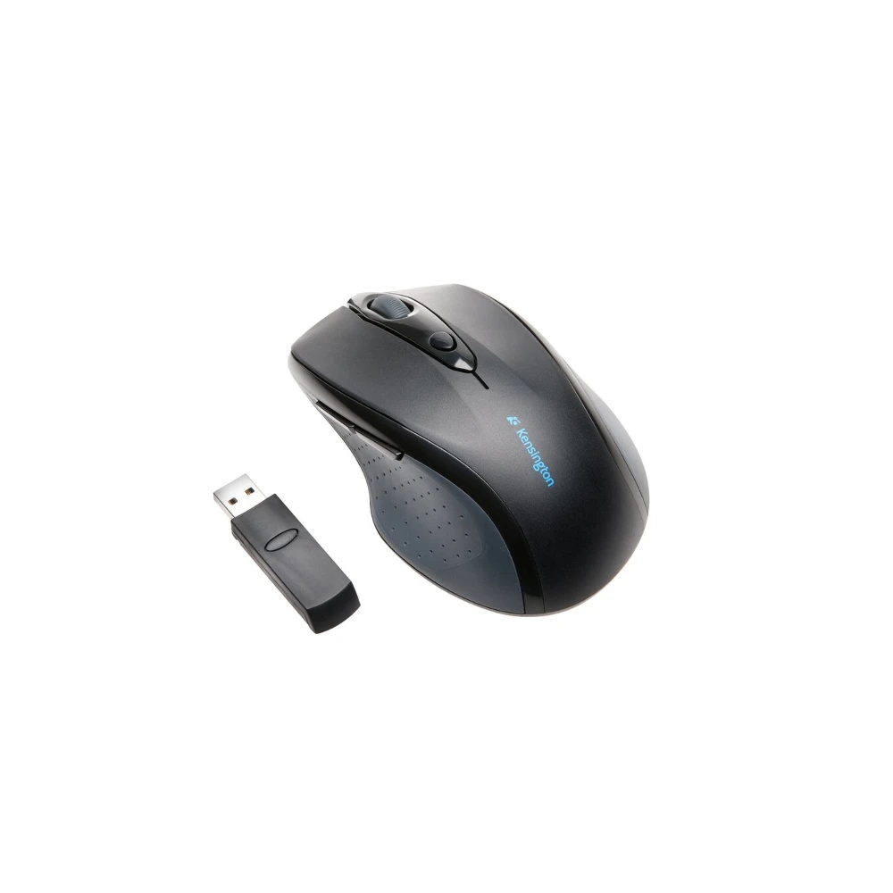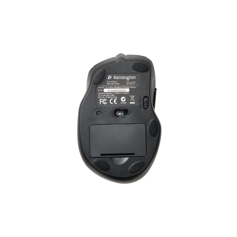 Kensington Pro Fit Wireless Mouse - Full Size. Form factor: Ambidextrous. Movement detection technology: Optical, Device interface: RF Wireless, Movement resolution: 1600 DPI, Buttons type: Pressed buttons, Buttons quantity: 6, Scroll type: Wheel. Power source: Batteries. Product colour: Black