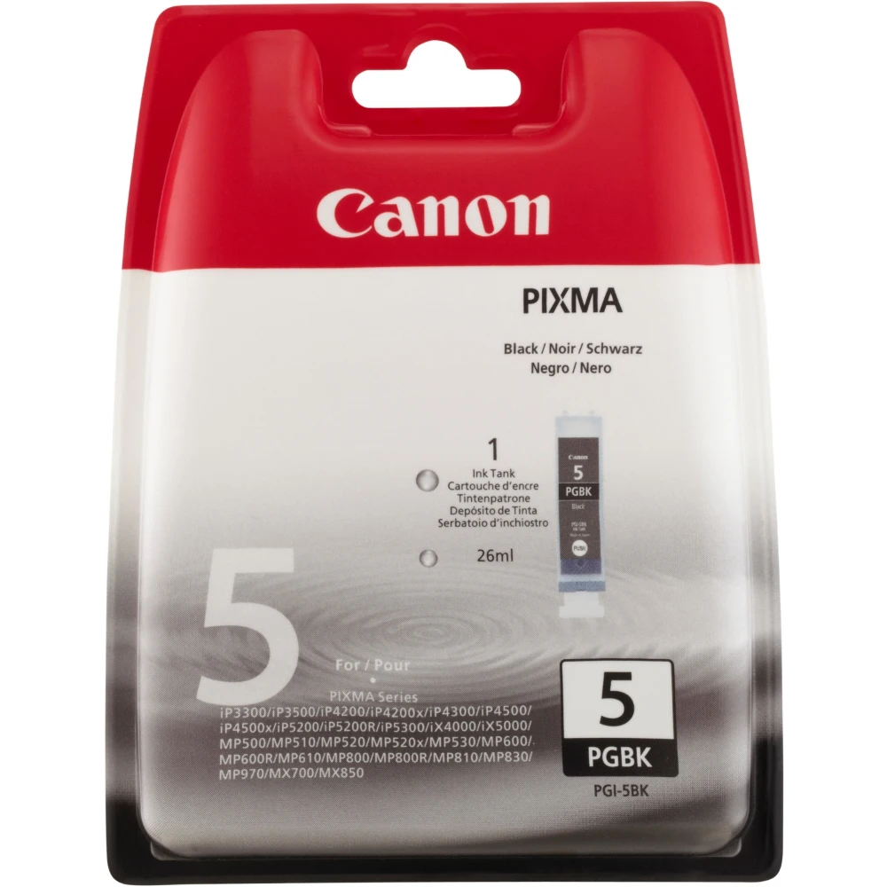 Canon PGI-5BK. Cartridge capacity: Standard Yield, Black ink type: Pigment-based ink, Printing colours: Black, Quantity per pack: 1 pc(s)