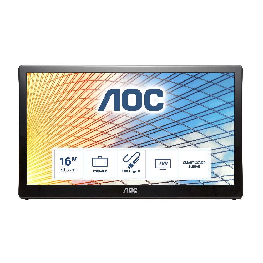 AOC 59 Series E1659FWU. Display diagonal: 39.6 cm (15.6"), Display resolution: 1366 x 768 pixels. Display: LED. Response time: 12 ms, Native aspect ratio: 16:9, Viewing angle, horizontal: 90°, Viewing angle, vertical: 60°. Built-in USB hub, USB hub version: 3.2 Gen 1 (3.1 Gen 1). VESA mounting. Product colour: Black
