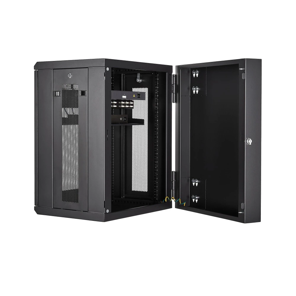 - 15U wall mount network cabinet allows easy access to equipment w/ 180? hinged design and lockable and removable front rear/side panels - Includes 1U shelf 3m hook-and-loop fastener & 4 keys for doors/panels - 200 lb. weight cap 21" deep enclosure w/16" equipment mounting depth and top cable holes - Pre-assembled IT data rack includes 50 cage nuts/screws for easy installation of server room devices - Designed for cooling equipment with mesh panels/doors and support for 4 optional 120mm fans