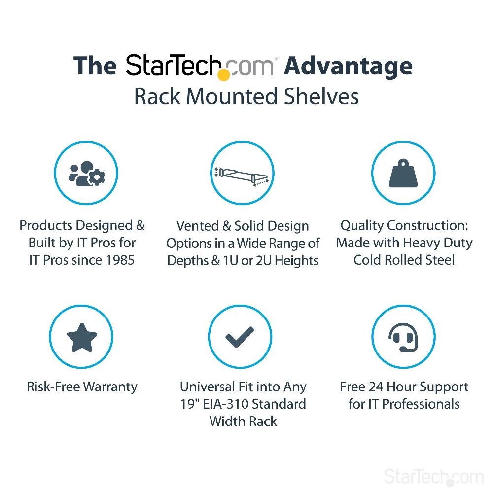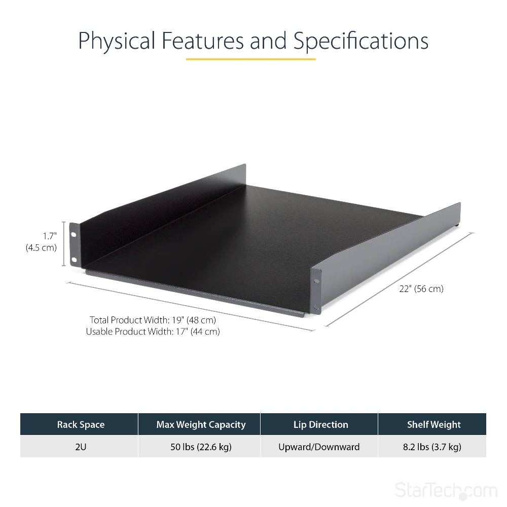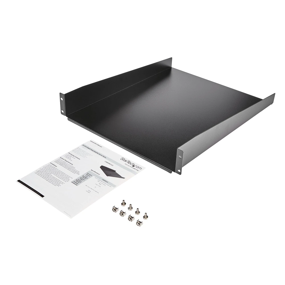 StarTech.com 2U Server Rack Shelf - Universal Rack Mount Cantilever Shelf for 19" Network Equipment Rack & Cabinet - Heavy Duty Steel Weight Capacity 50lb/23kg - 22" Deep Tray, Black, Rack shelf, Black, Steel, 22.6 kg, 2U, 465 mm