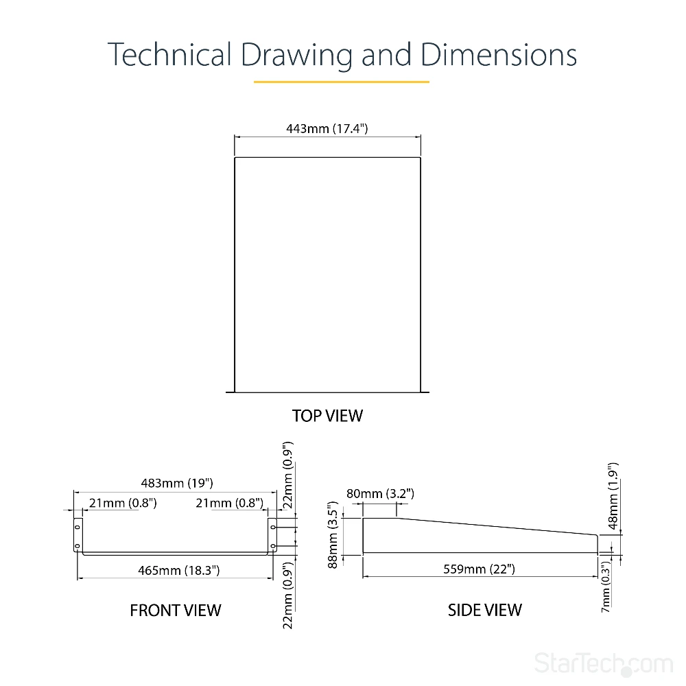 StarTech.com 2U Server Rack Shelf - Universal Rack Mount Cantilever Shelf for 19" Network Equipment Rack & Cabinet - Heavy Duty Steel – Weight Capacity 50lb/23kg - 22" Deep Tray, Black (CABSHELF22) StarTech.com 2U Server Rack Shelf - Universal Rack Mount Cantilever Shelf for 19" Network Equipment Rack & Cabinet - Heavy Duty Steel – Weight Capacity 50lb/23kg - 22" Deep Tray, Black. Type: Shelf, Product colour: Black, Housing material: Steel. Width: 465 mm, Depth: 558.8 mm, Height: 88 mm. Package width: 566 mm, Package depth: 585 mm, Package height: 110 mm. Screw type: M5. Master (outer) case width: 566 mm, Master (outer) case length: 585 mm, Master (outer) case height: 110 mm - 2U 19" Server rack cabinet shelf 22" deep/ EIA/ECA-310 compliant for universal fit in any existing server/AV cabinet or enclosure/w/cage nuts and screws for mounting - Heavy-duty cantilever tray is easy to install w/durable 16 gauge SPCC commercial cold-rolled steel holding up to 50lbs - For flexibility shelf mounts in multiple orientations w/lips on one side to prevent equipment sliding off - Compatible w/StarTech.com racks plus brands like HP APC Dell w/24 hr tech support Add a sturdy, 22in depth fixed shelf into almost any server rack or cabinet