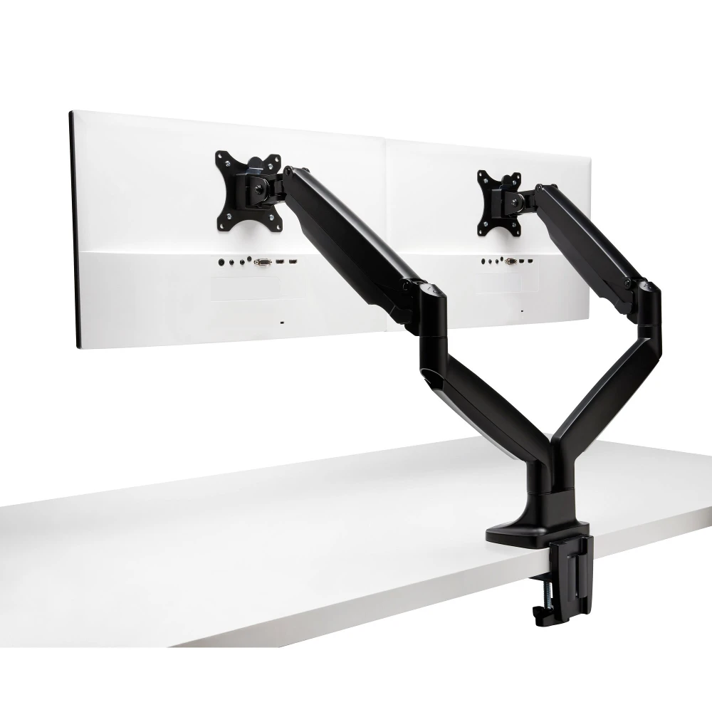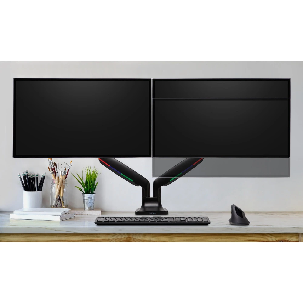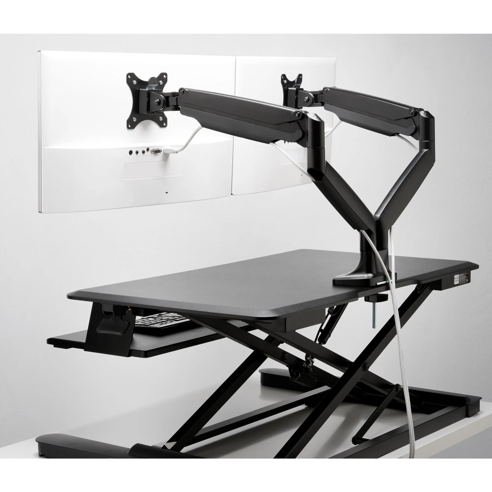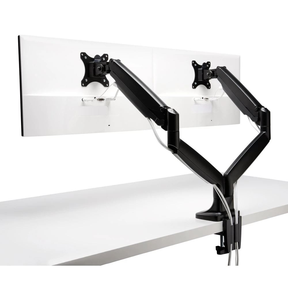 SmartFit One-Touch Height-Adjustable Dual Monitor Arm Kensington SmartFit One-Touch Height-Adjustable Dual Monitor Arm. Mounting: Clamp, Maximum weight capacity: 9 kg, Minimum screen size: 33 cm (13"), Maximum screen size: 86.4 cm (34"), Minimum VESA mount: 75 x 75 mm, Maximum VESA mount: 100 x 100 mm. Height adjustment, Tilt angle range: -90 - 90°. Product colour: Black The dual monitor arm with one-touch convenience. Professionals who spend long hours working at a desk often struggle with poor posture, eye strain, as well as neck, back and shoulder discomfort. The SmartFit™ One-Touch Height Adjustable Dual Monitor Arm supports more comfortable monitor placement. Thoughtfully designed to simplify proper ergonomic fit, it offers a fully articulating design for maximum flexibility. A heavy-duty build provides stability in every position while its gas spring monitor mount makes adjusting the height, depth and angle of your monitors effortless — from landscape to portrait mode. The built-in cable management system organises and conceals cables while the arm lifts your external monitor up and out of the way, decluttering and clearing valuable desk space.