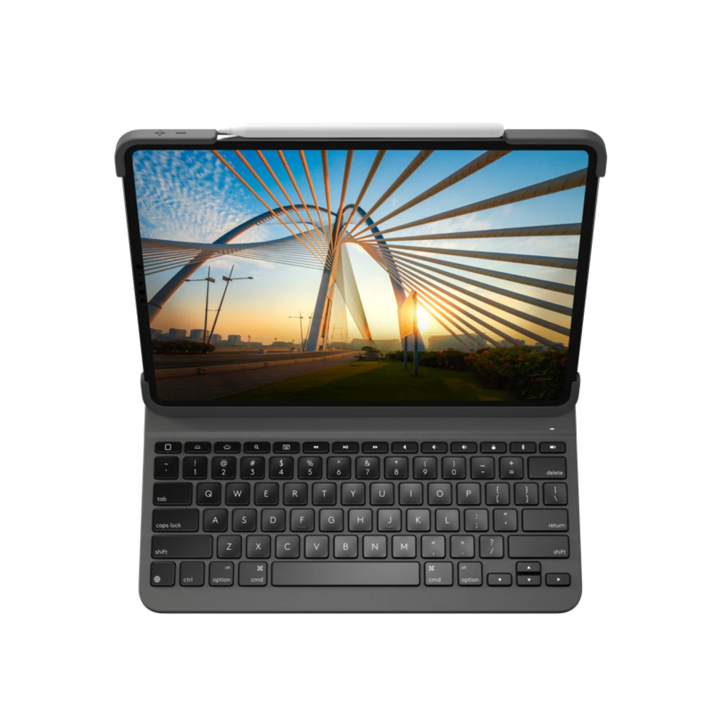 Slim Folio Pro for iPad Pro 11-inch (1st, 2nd & 3rd generation) Logitech Slim Folio Pro for iPad Pro 11-inch (1st, 2nd & 3rd generation). Keyboard layout: QWERTY, Keyboard language: UK English, Key pitch: 1.7 cm. Brand compatibility: Apple, Compatibility: iPad Pro 11" (1st, 2nd, 3rd gen), Product colour: Graphite. Connectivity technology: Wireless, Device interface: Bluetooth. Power source: Battery, Battery type: Built-in battery, Battery technology: Lithium Polymer (LiPo). Mobile operating systems supported: iPadOS Turn your iPad Pro 11-inch (1st and 2nd gen)into a laptop with Slim Folio Pro. This all-in-one case offers a backlit laptop-like keyboard plus front and back iPad Pro protection. Turn your iPad Pro into a laptop with one click. Enjoy laptop-like typing anywhere, day or night, with Slim Folio Pro for iPad Pro 11-inch (1st and 2nd gen). Three distinct use modes ensure you can always work at your highest level no matter where you are — a café table, desk, or even your lap.