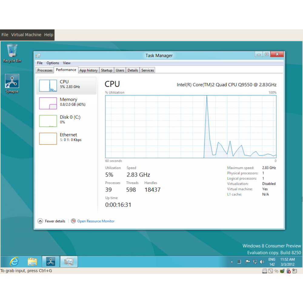 Dopo aver installato il futuro ambiente operativo di Microsoft in una macchina virtuale , mi son reso conto che questa preview sembra funzionare molto bene (succhia un po di risorse, ma è allineato con Win7) . Ovviamente la nuova interfaccia utente mi lascia un pochino smarrito, tipo non ho capito come si chiudono le applicazioni, la versione di Internet Explorer installata è la 9.
