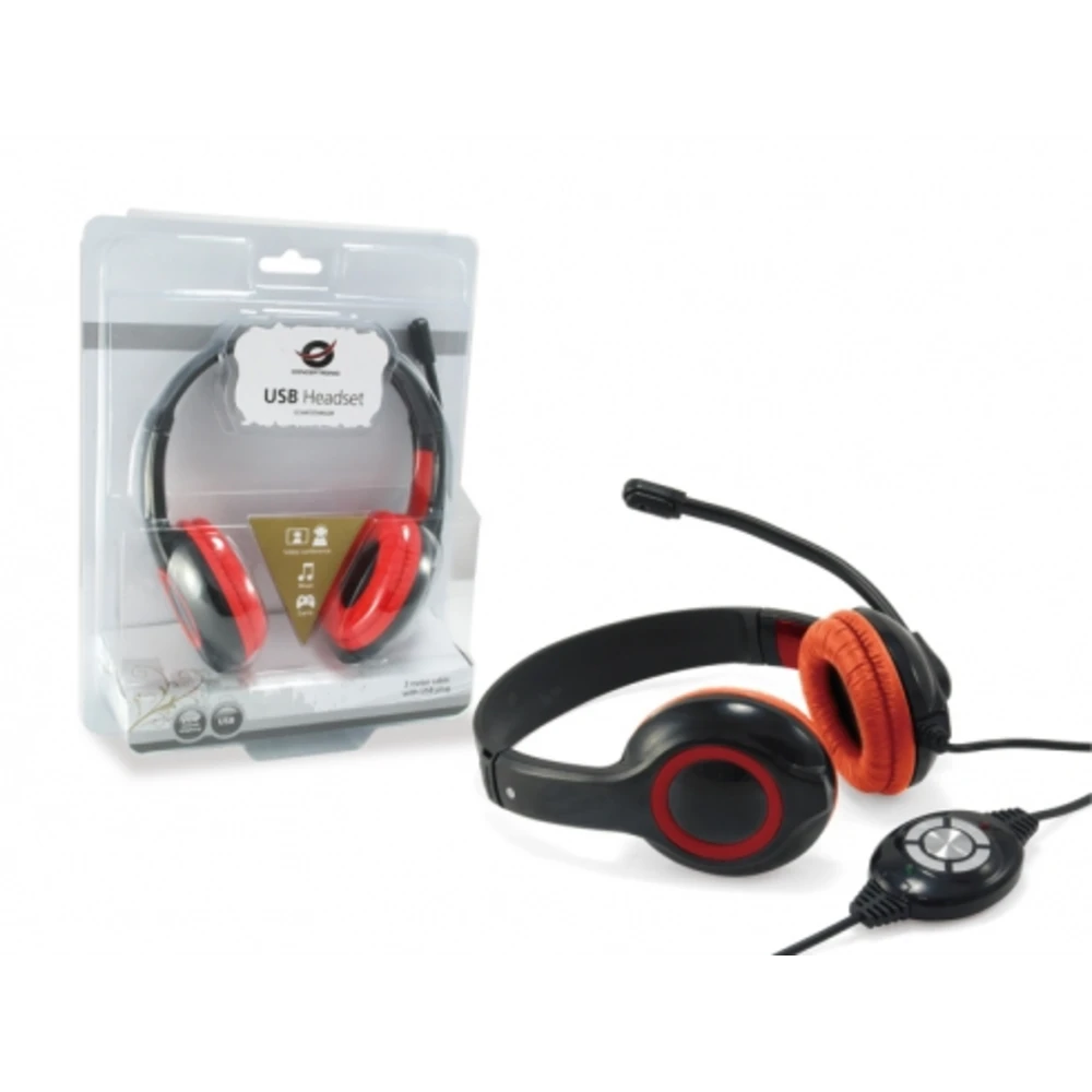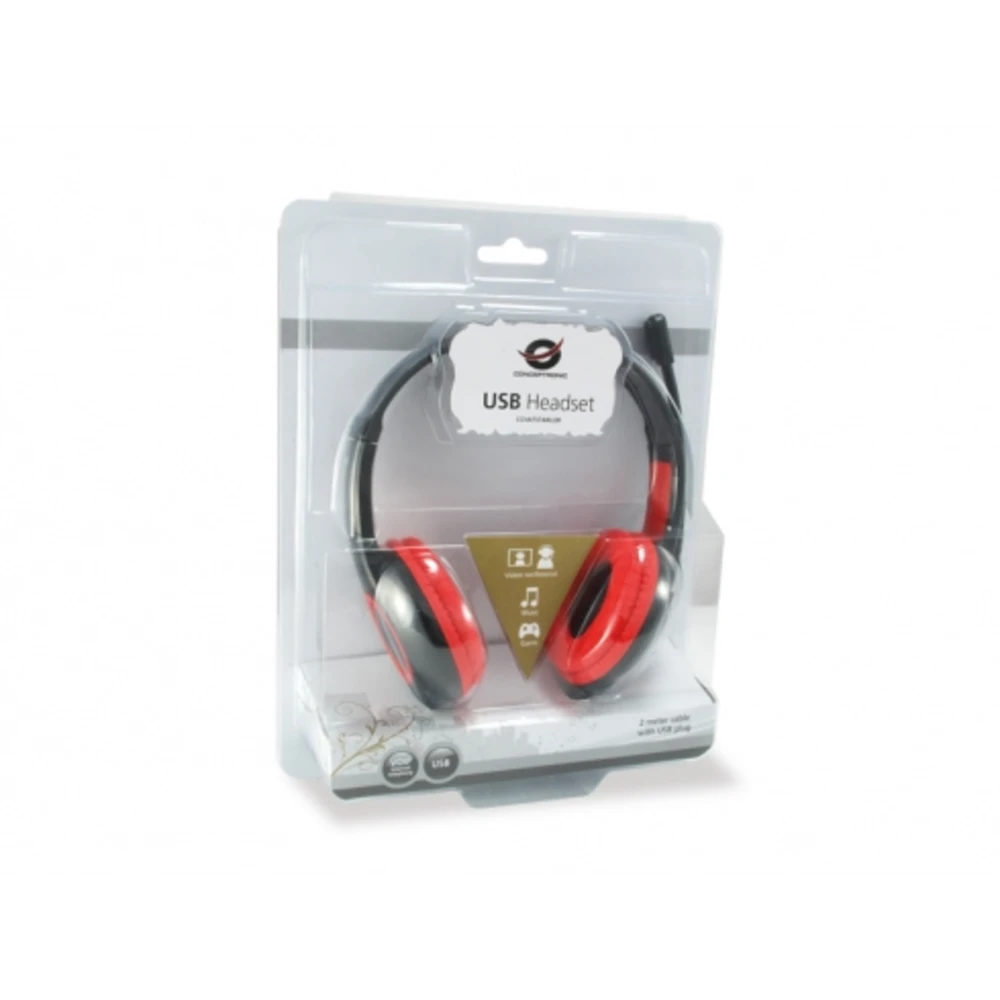 USB Headset, 20Hz-20kHz, 32O, USB 2.0, 2 m, Red Conceptronic USB Headset. Product type: Headset. Connectivity technology: Wired. Recommended usage: Calls/Music. Headphone frequency: 20 - 20000 Hz. Cable length: 2 m. Weight: 169 g. Product colour: Red This USB Headset is a comfortable stereo headset to use at home or at the office for listening to music, playing games, chatting and video conferencing. This headset comes with a flexible microphone and a 2 meter cable.