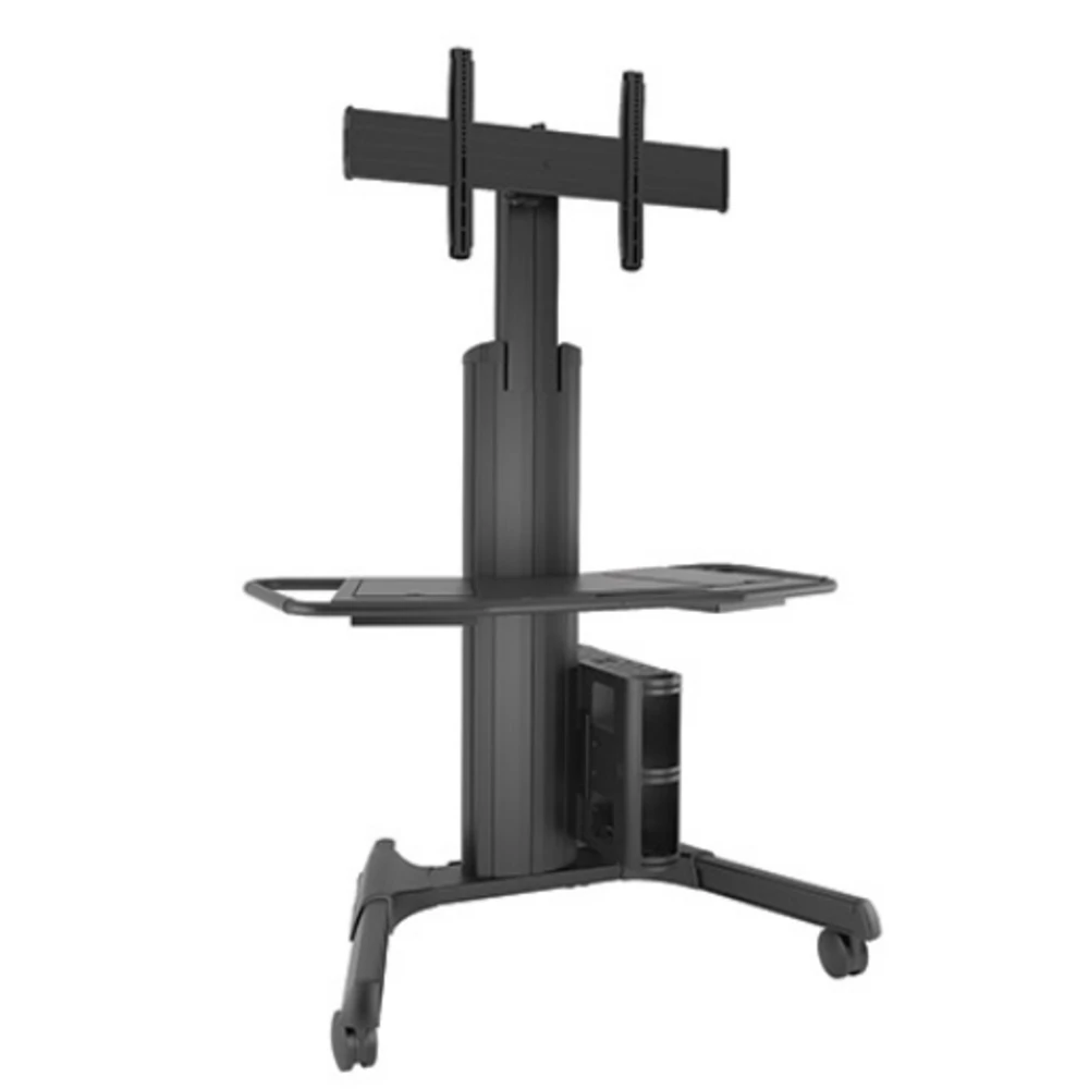 This mobile Fusion cart incorporates rounded edges and sleek features to give the cart a softer professional feel that fits well in corporate and classroom environments. The height can be adjusted by one person via hand or 1/2" hex bit on a power drill.