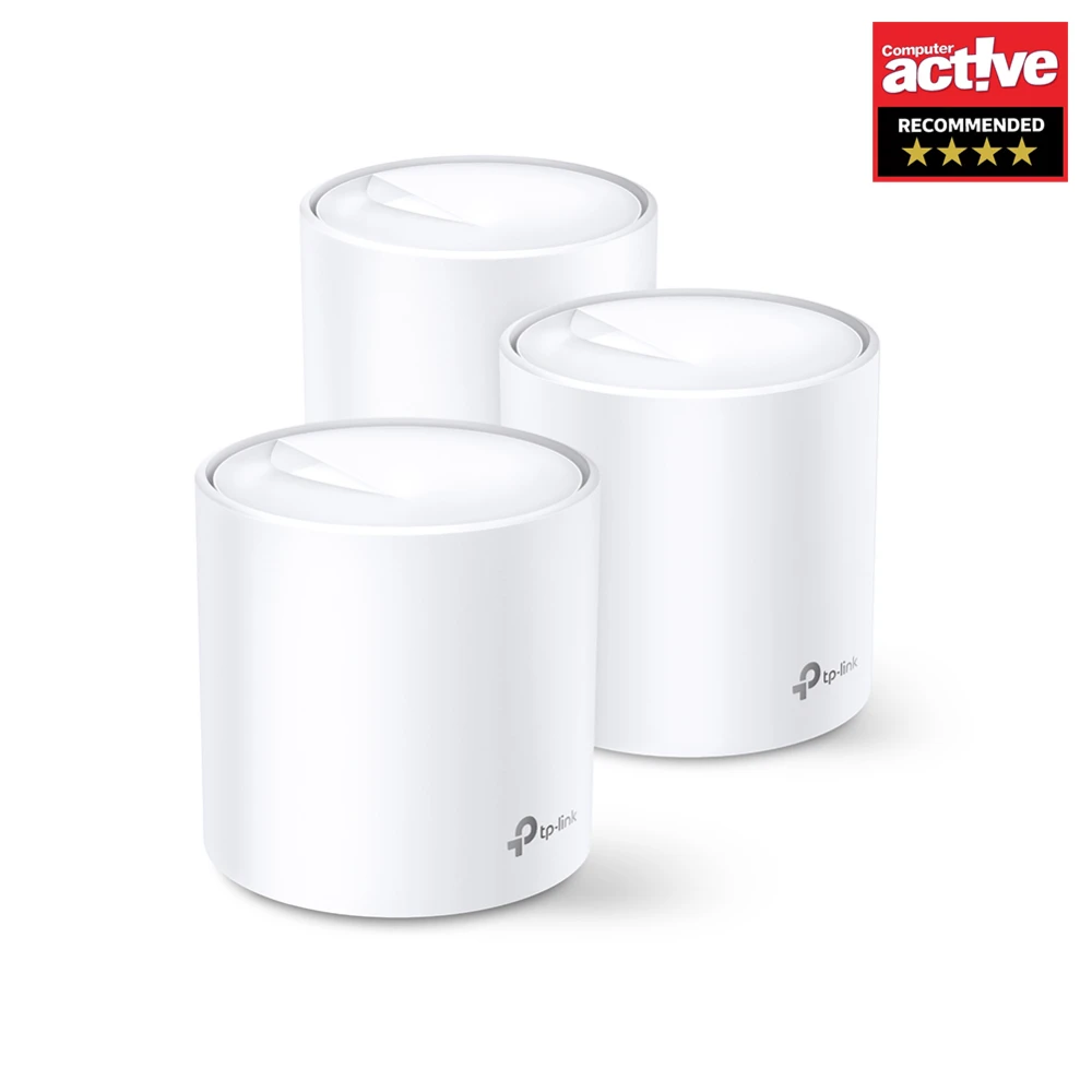TP-Link AX3000 Whole Home Mesh Wi-Fi System, 3-Pack. Product colour: White, Antenna type: Internal, LED indicators: Power, Status. Wi-Fi band: Dual-band (2.4 GHz / 5 GHz), Top Wi-Fi standard: Wi-Fi 6 (802.11ax), Wi-Fi standards: 802.11a, 802.11b, 802.11g, Wi-Fi 4 (802.11n), Wi-Fi 5 (802.11ac), Wi-Fi 6 (802.11ax). Firewall security: SPI, Mobile operating systems supported: Android 4.4, Android 5.0, Android 5.1, Android 6.0, Android 7.0, Android 7.1, Android 7.1.2,.... AC adapter input voltage: 100 - 240 V, AC adapter frequency: 50/60 Hz, AC adapter input current: 0.6 A. Width: 110 mm, Depth: 110 mm, Height: 114 mm