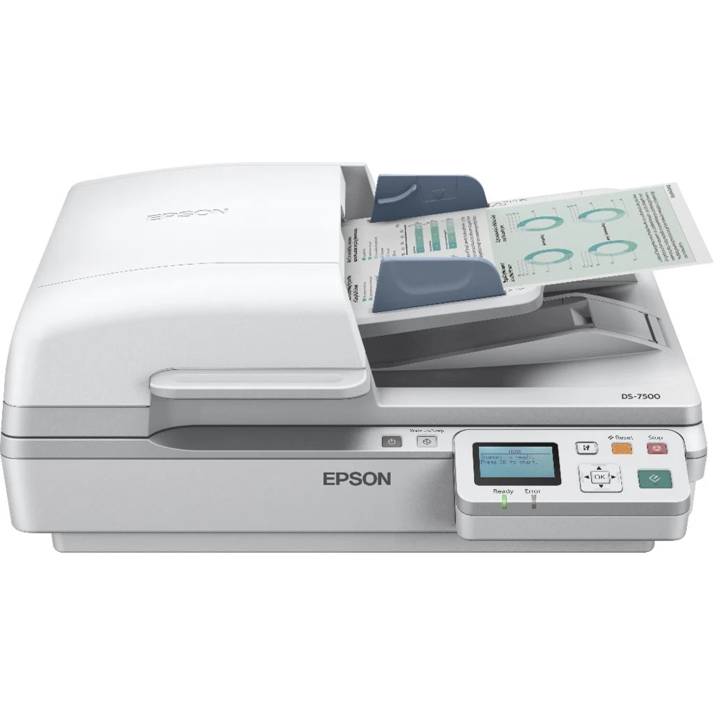 WorkForce DS-6500N - 1200 dpi x 1200 dpi, 25ppm/25ppm, 100 mm x 148 mm - 215.9 mm x 1016 mm, LCD, LAN, 10.28 kg Epson WorkForce DS-6500N. Maximum scan size: 215.9 x 1016 mm, Optical scanning resolution: 1200 x 1200 DPI, Input colour depth: 48 bit. Scanner type: Flatbed scanner, Product colour: White, Display: LCD. Daily duty cycle (max): 3000 pages, Light source: ReadyScan LED, Scan file formats: JPG, PDF, TIFF. Auto document feeder (ADF) input capacity: 100 sheets. Maximum ISO A-series paper size: A4, ISO A-series sizes (A0...A9): A4, Auto Document Feeder (ADF) media weight: 50 - 128 g/m² This A4 networked scanner addresses the needs of companies who require reliable and versatile document capture conversion, for electronic document archiving and distribution.