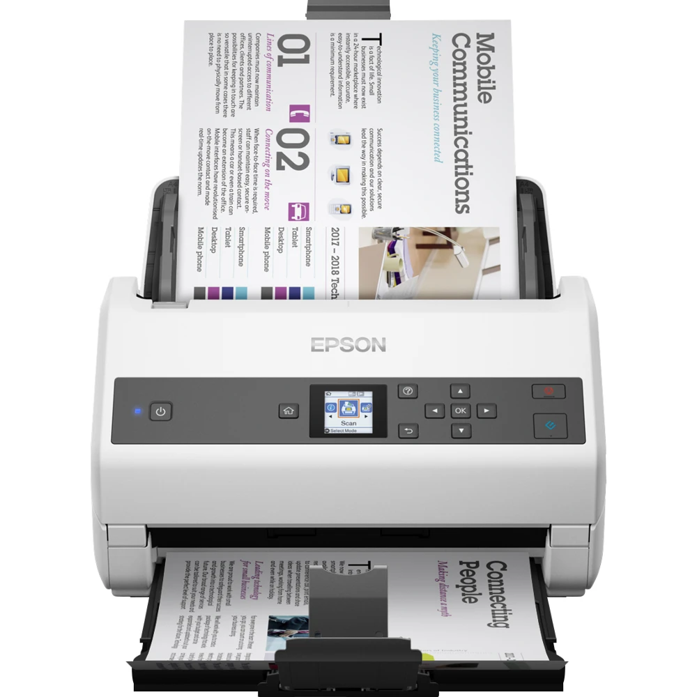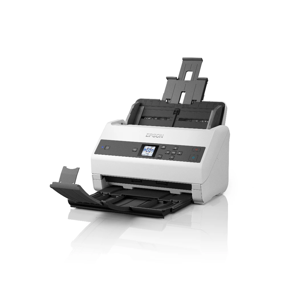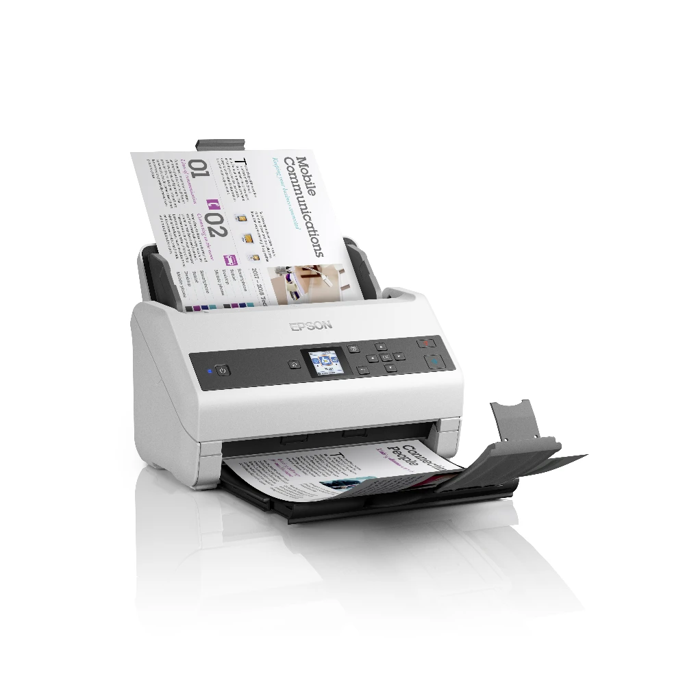 Epson WorkForce DS-870. Optical scanning resolution: 600 x 600 DPI, Input colour depth: 30 bit, Output colour depth: 24 bit. Scanner type: Sheet-fed scanner, Product colour: Grey, White, Display: LCD. Sensor type: CIS, Daily duty cycle (max): 7000 pages, Scan file formats: JPEG, PDF, TIFF. Auto document feeder (ADF) input capacity: 100 sheets. Maximum ISO A-series paper size: A4, Scanning media types supported: Business Card, Plastic Card, Post Card(JPN), ISO A-series sizes (A0...A9): A3, A4, A5, A6