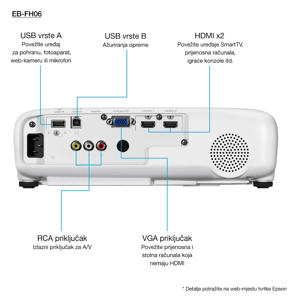 Epson EB-FH06. Projector brightness: 3500 ANSI lumens, Projection technology: 3LCD, Projector native resolution: 1080p (1920x1080). Light source type: Lamp, Service life of light source: 6000 h, Service life of light source (economic mode): 12000 h. Focus: Manual, Focal length range: 16.9 - 20.28 mm, Aperture range (F-F): 1.49 - 1.72. Analog signal format system: NTSC, NTSC 4.43, PAL, PAL 60, PAL M, PAL N, SECAM, Video processing: 10 bit, Video colour modes: Blackboard, Cinema, Dynamic, Presentation, sRGB. Noise level: 37 dB, Noise level (economic mode): 28 dB, Country of origin: Philippines