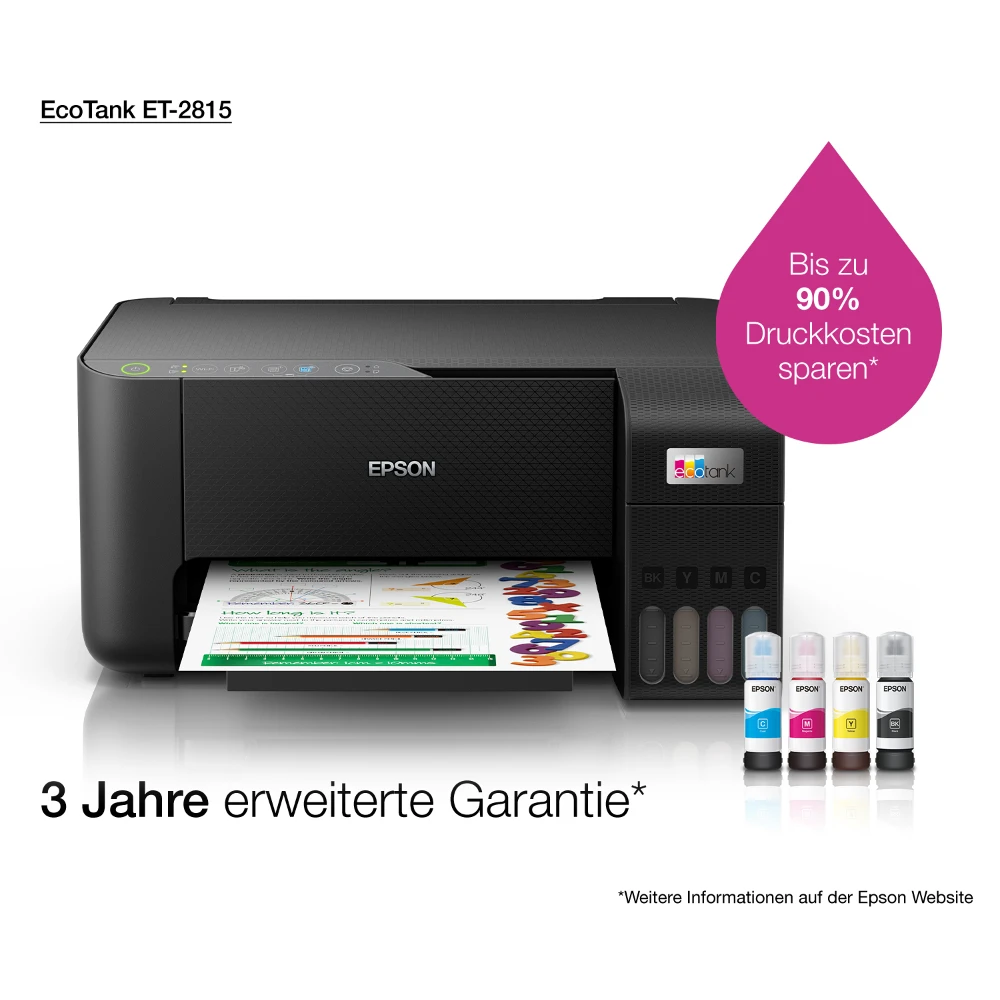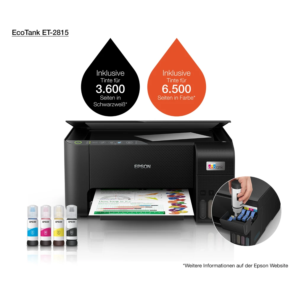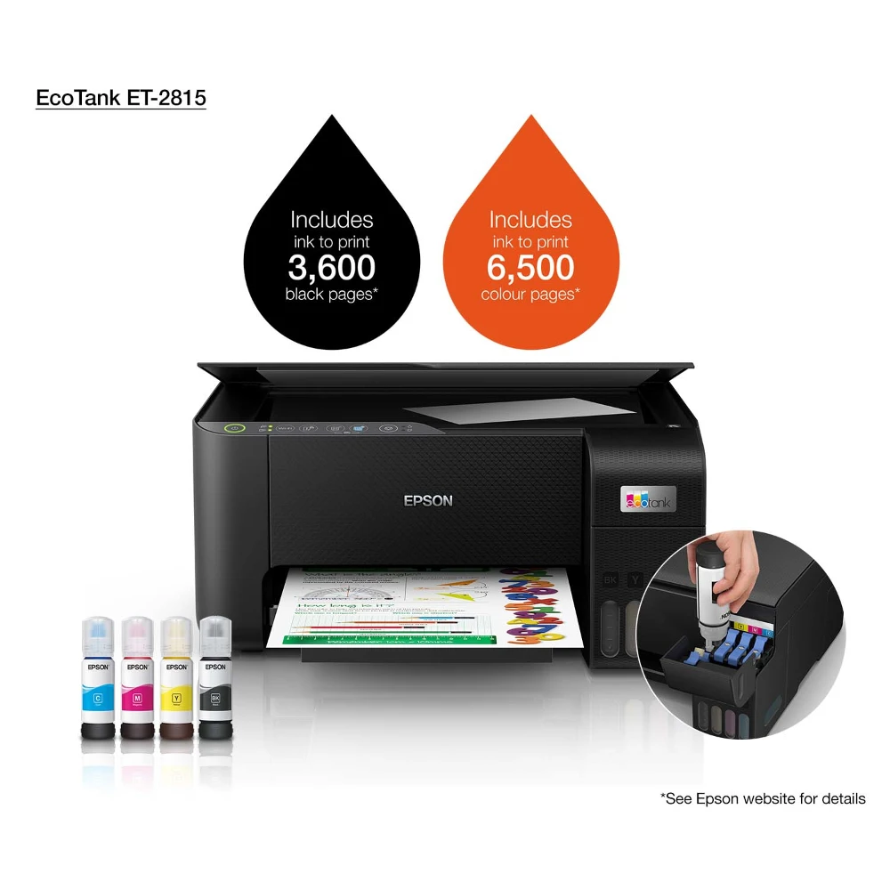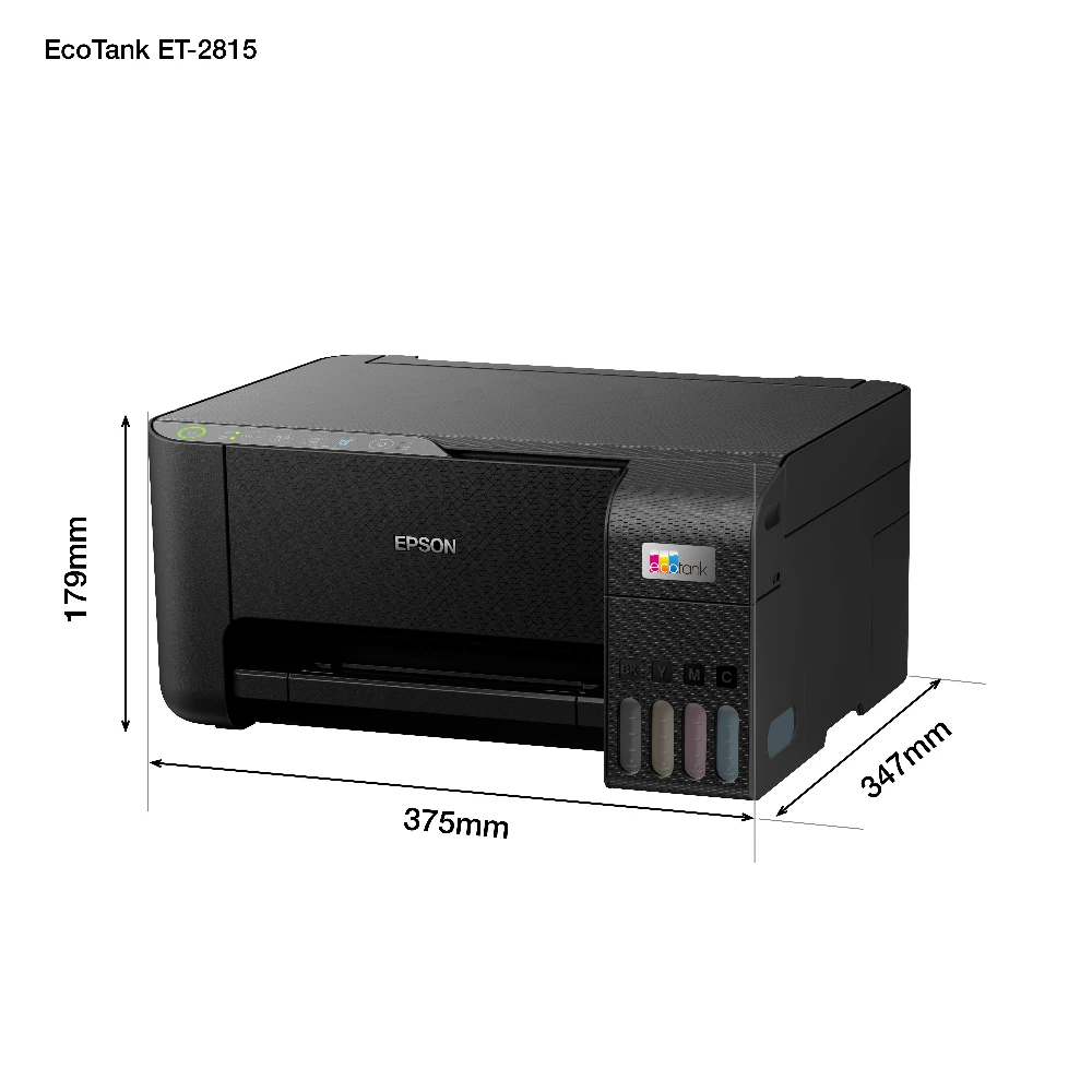 Epson EcoTank ET-2815. Print technology: Inkjet, Printing: Colour printing, Maximum resolution: 5760 x 1440 DPI, Print speed (colour, normal quality, A4/US Letter): 15 ppm. Copying: Colour copying. Scanning: Colour scanning, Optical scanning resolution: 1200 x 2400 DPI. Duplex functions: Print. Maximum ISO A-series paper size: A4. Wi-Fi. Direct printing. Product colour: Black