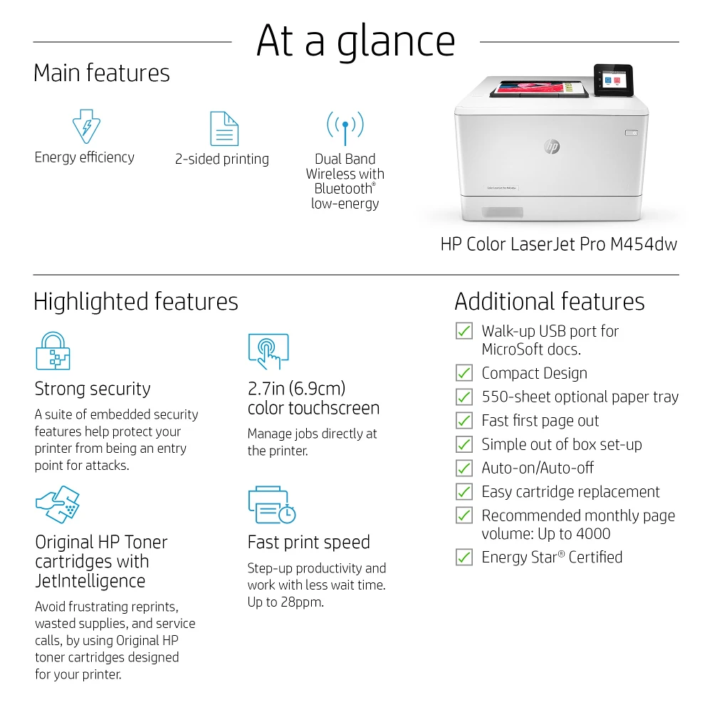 HP Color LaserJet Pro M454 printer. Designed to let you focus on growing business, staying ahead.