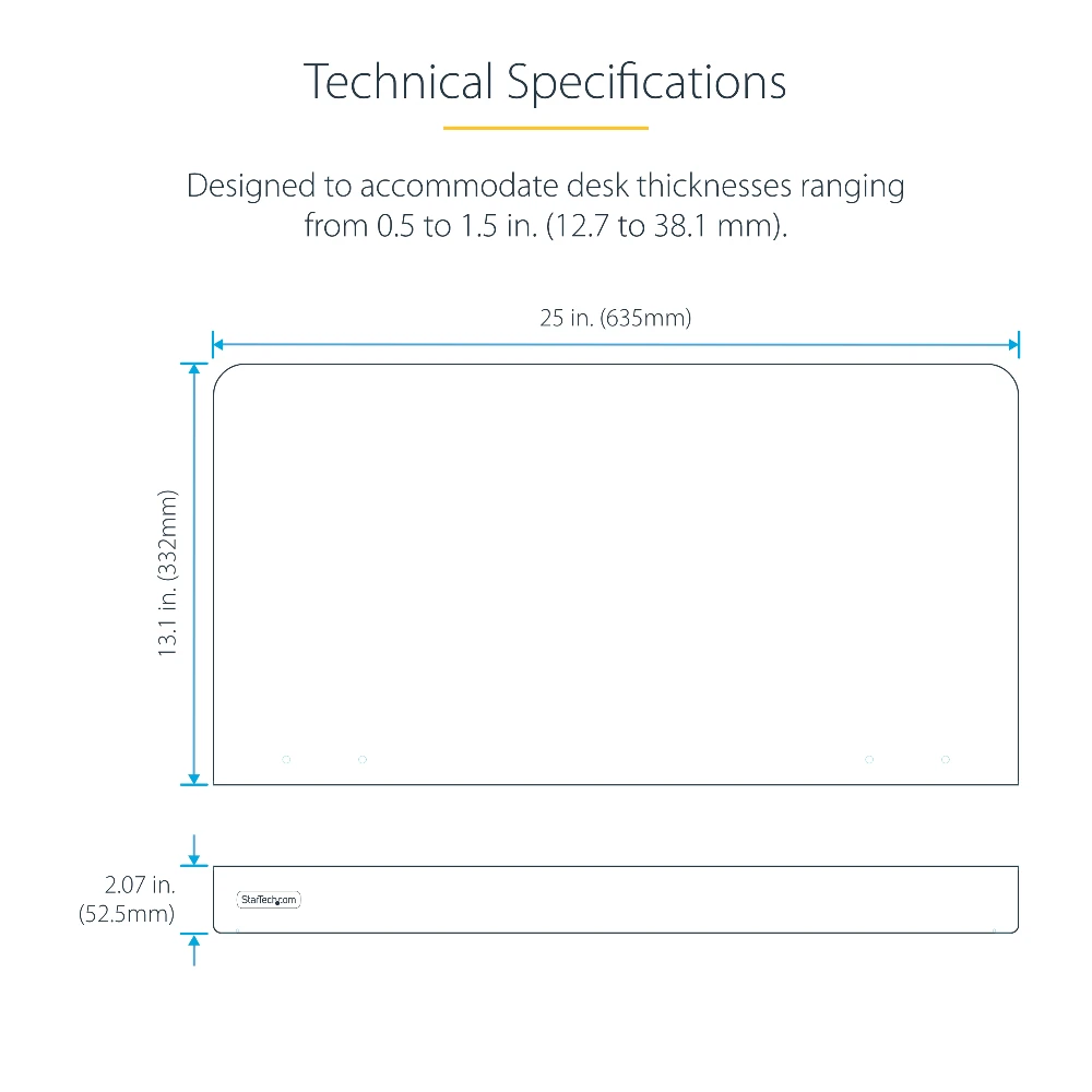 StarTech.com Clamp-On Steel Desk Corner Sleeve for L-Shaped/Corner Desk, For 0.5-1.5in (12.7-38.1mm) Desks, Increase Space for Keyboard/Mouse, Desk Extender/Tray For Wooden/Steel Desks (DSKCRNRSLV) StarTech.com Clamp-On Steel Desk Corner Sleeve for L-Shaped/Corner Desk, For 0.5-1.5in (12.7-38.1mm) Desks, Increase Space for Keyboard/Mouse, Desk Extender/Tray For Wooden/Steel Desks, Ships Assembled. Material: Steel, Product colour: Black. Width: 332 mm, Length: 635 mm, Height: 52 mm - Maximize desk space with this steel corner sleeve for 90? L-Shaped/Corner desks - Increase workspace for a keyboard and mouse while resting the arms on the desk extender; Usable surface is 25x13.1in - Supported desk thickness 0.5-1.5 in - The knob-less clamp allows for enough clearance of knees/chair armrests; For wood or metal desks; Permanent or no-drill installation - The sturdy desk shelf ships fully assembled; Foam pads protect the surface - The desk tray is backed for 5-years