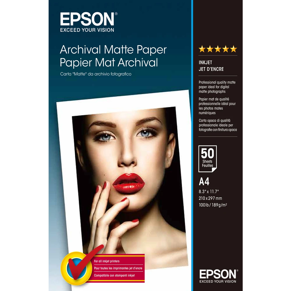 Archival Matte Paper - A4 - 50 Sheets Epson Archival Matte Paper - A4 - 50 Sheets. Finish type: Matte, Media weight: 192 g/m², Paper size: A4. Width: 210 mm, Height: 297 mm. Quantity per pack: 1 pc(s), Package width: 220 mm, Package depth: 300 mm. Pallet width (UK): 100 cm, Pallet length (UK): 120 cm, Pallet height (UK): 100 cm. Country of origin: Japan This matte 189 g/m² paper-based medium is exclusively used with pigment ink. With the current silver-halogenide system, users could not print out matte pictures unless they subjected them to a complicated procedure. This paper is not the only solution for this complex procedure; however, it is attractive for many professional users that have been waiting for such a type of paper for a long time.