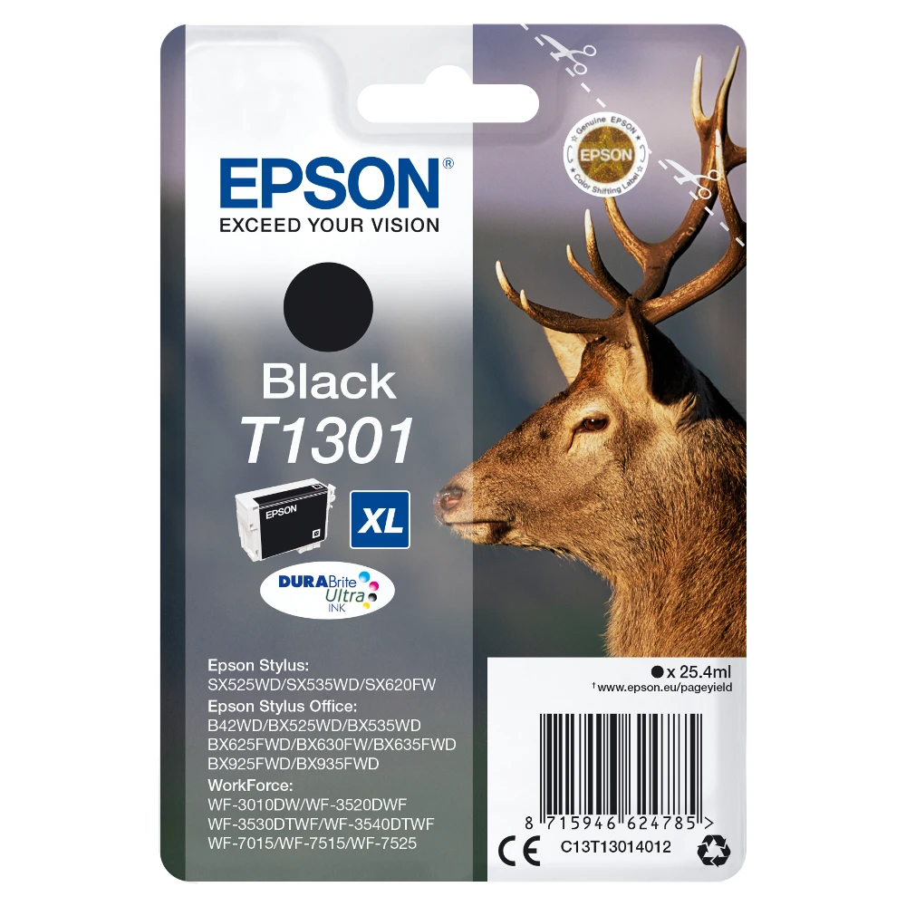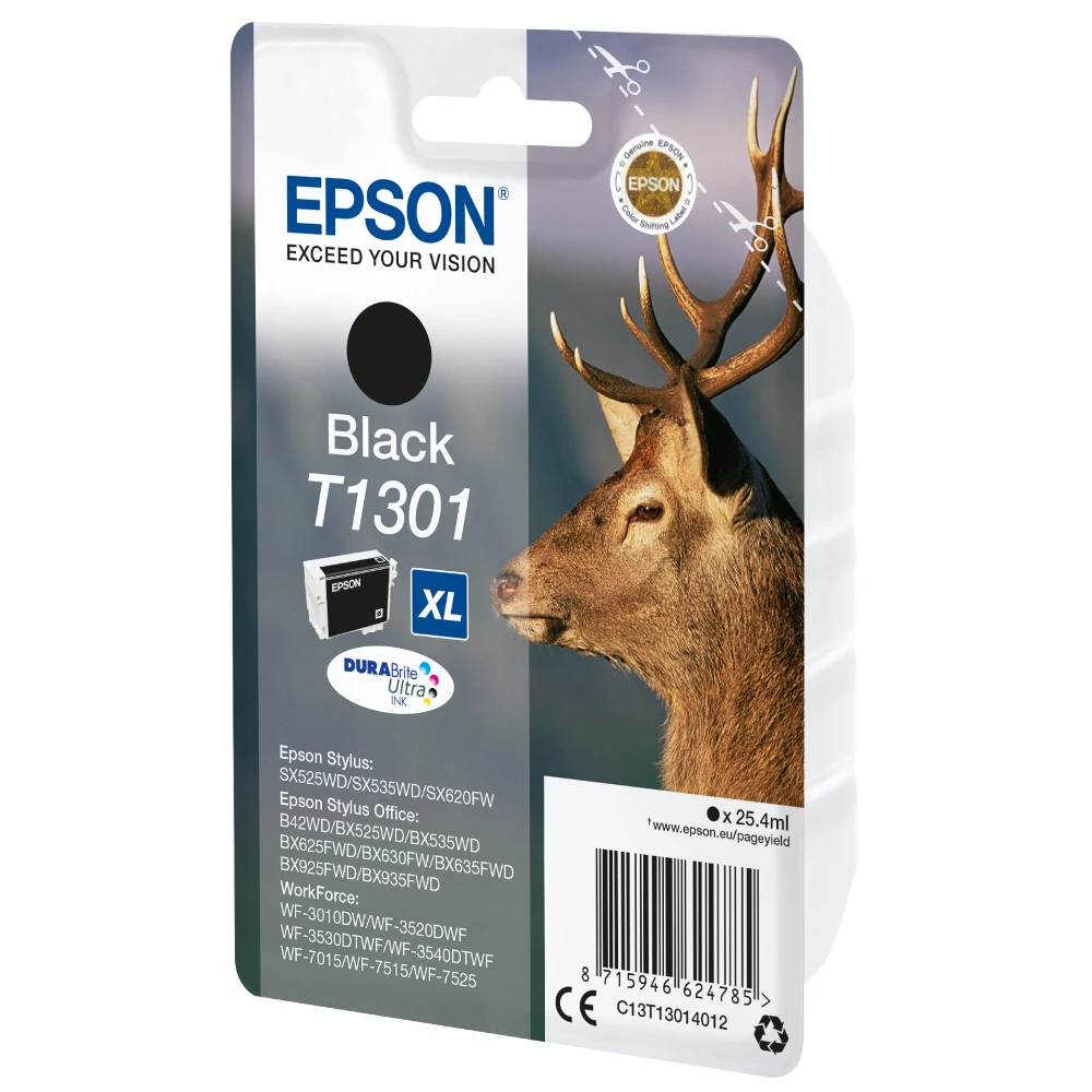 Epson Stag Singlepack Black T1301 DURABrite Ultra Ink. Cartridge capacity: High (XL) Yield, Black ink type: Pigment-based ink, Black ink volume: 25.4 ml, Printing colours: Black, Quantity per pack: 1 pc(s)