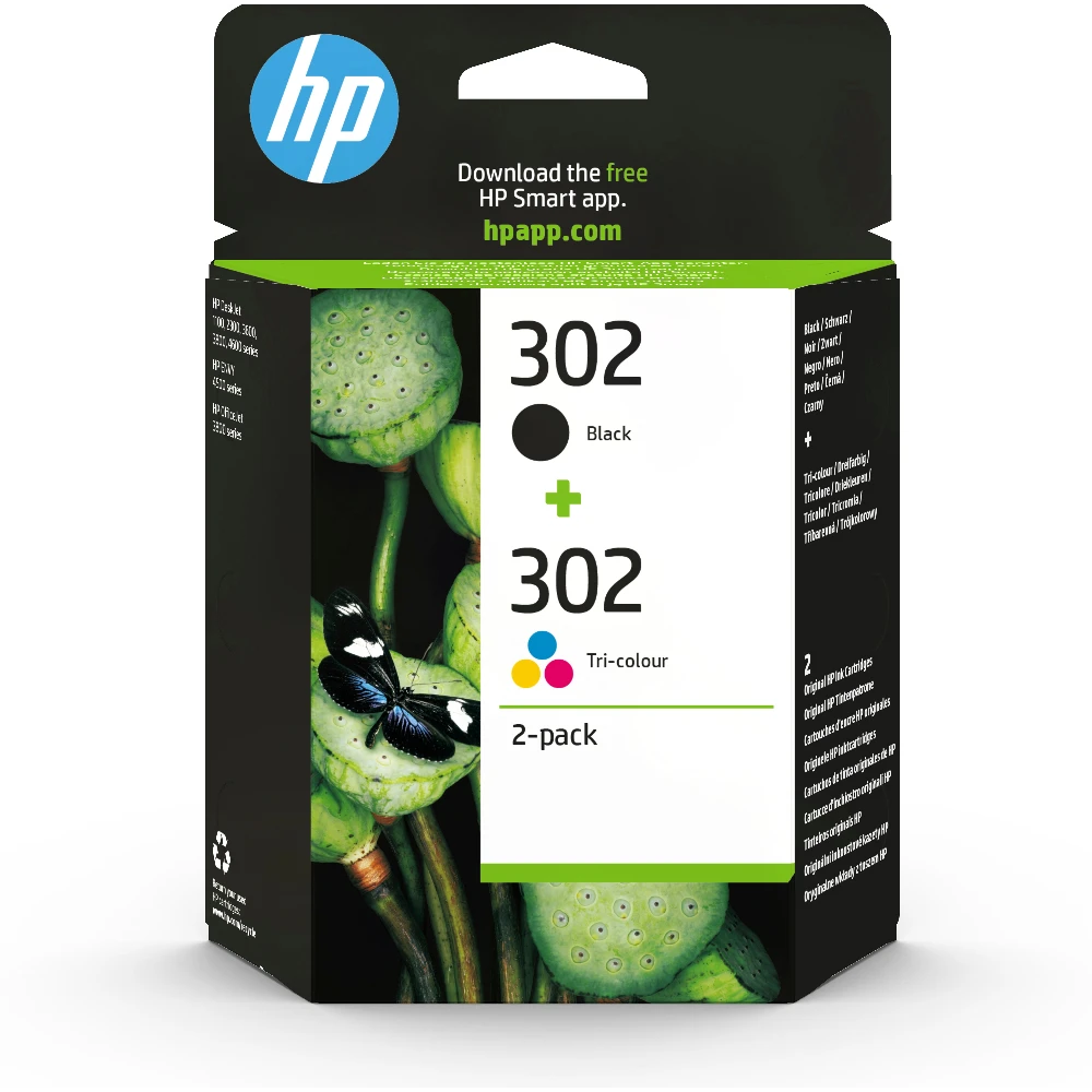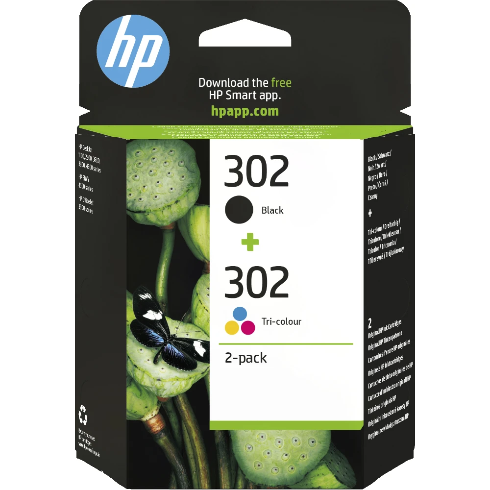 HP 302 2-pack Black/Tri-color Original Ink Cartridges. Colour ink type: Dye-based ink, Cartridge capacity: Standard Yield, Black ink type: Pigment-based ink, Black ink volume: 3.5 ml, Supply type: Multi pack, Colour ink page yield: 150 pages, Colour ink volume: 4 ml, Printing colours: Black, Cyan, Magenta, Yellow, Quantity per pack: 2 pc(s), Black ink page yield: 170 pages
