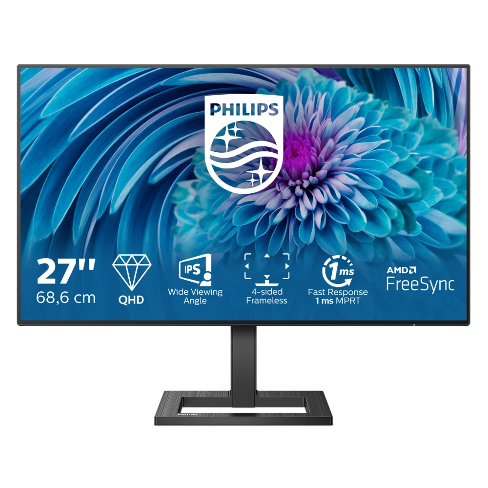 Philips E Line 275E2FAE/00. Display diagonal: 68.6 cm (27"), Display resolution: 2560 x 1440 pixels, HD type: Quad HD, Display technology: LED, Display surface: Matt, Response time: 4 ms, Native aspect ratio: 16:9, Viewing angle, horizontal: 178°, Viewing angle, vertical: 178°. Built-in speaker(s). VESA mounting, Height adjustment. Product colour: Black