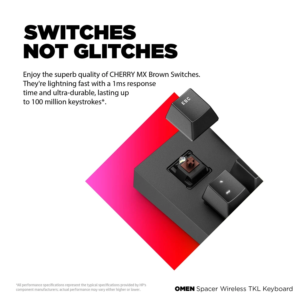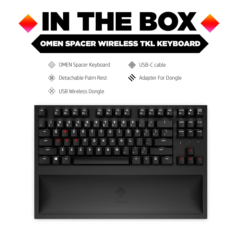 HP OMEN Spacer Wireless TKL Keyboard. Keyboard form factor: Full-size (100%). Keyboard style: Straight. Connectivity technology: Wireless, Device interface: RF Wireless, Keyboard key switch: Mechanical. Wrist rest. Recommended usage: Gaming. Product colour: Black