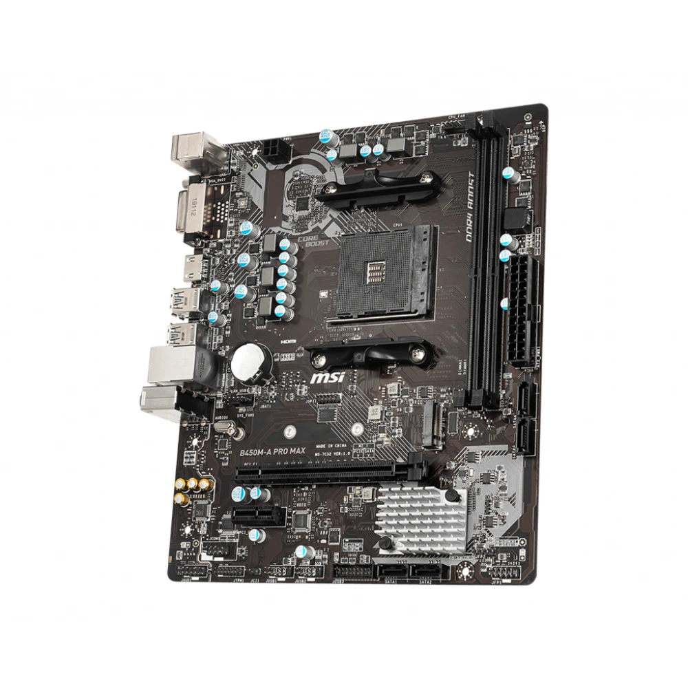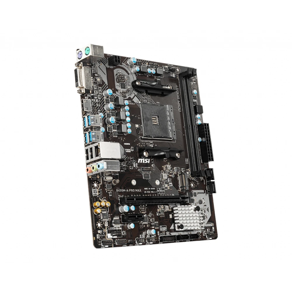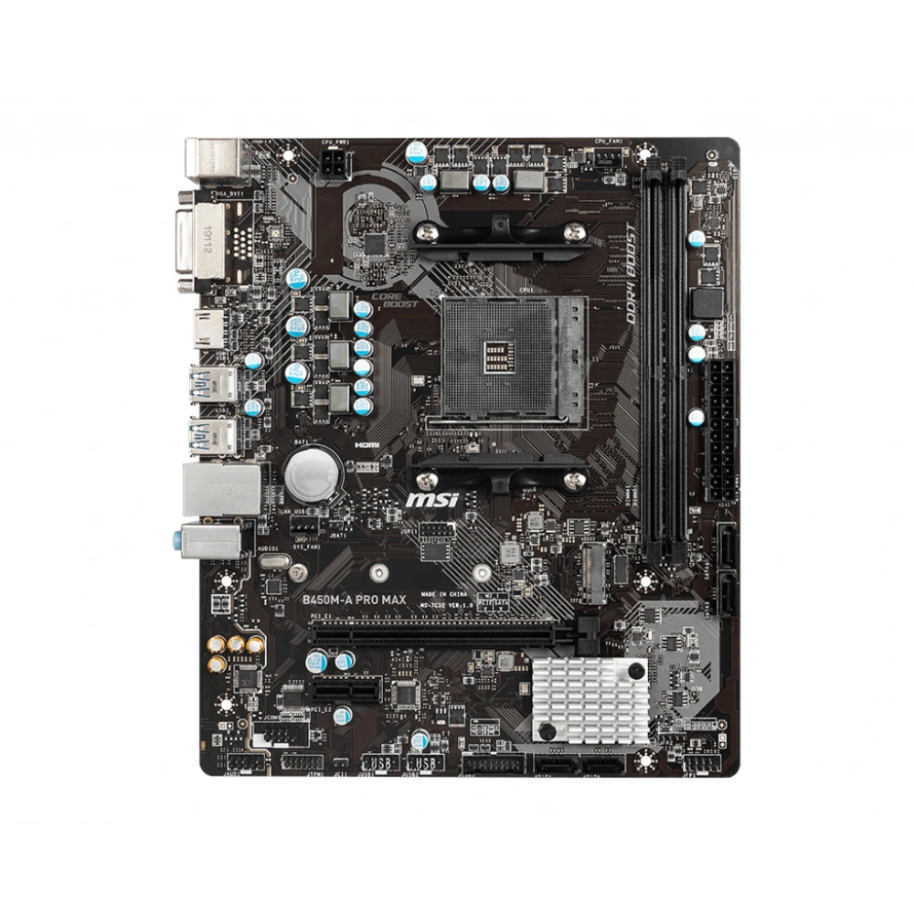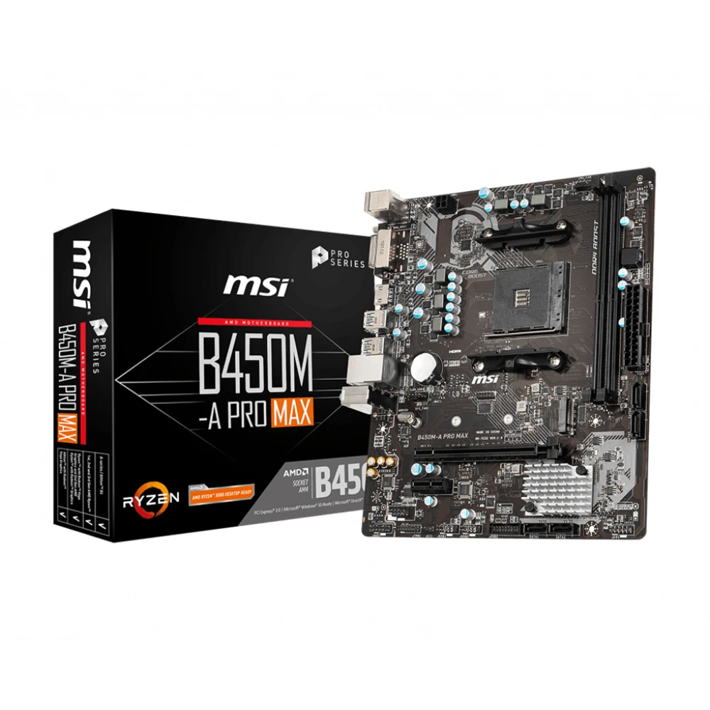 MSI B450M-A PRO MAX. Processor manufacturer: AMD, Processor socket: Socket AM4, Compatible processor series: AMD Athlon, AMD Ryzen, AMD Ryzen™ 3, 2nd Generation AMD Ryzen™ 3, 3rd Generation AMD Ryzen™.... Supported memory types: DDR4-SDRAM, Maximum internal memory: 32 GB, Memory slots type: DIMM. Supported storage drive interfaces: SATA III, Supported storage drive types: HDD & SSD. Maximum graphics card memory: 2048 MB, Maximum resolution: 4096 x 2160 pixels. USB connector type: USB Type-A