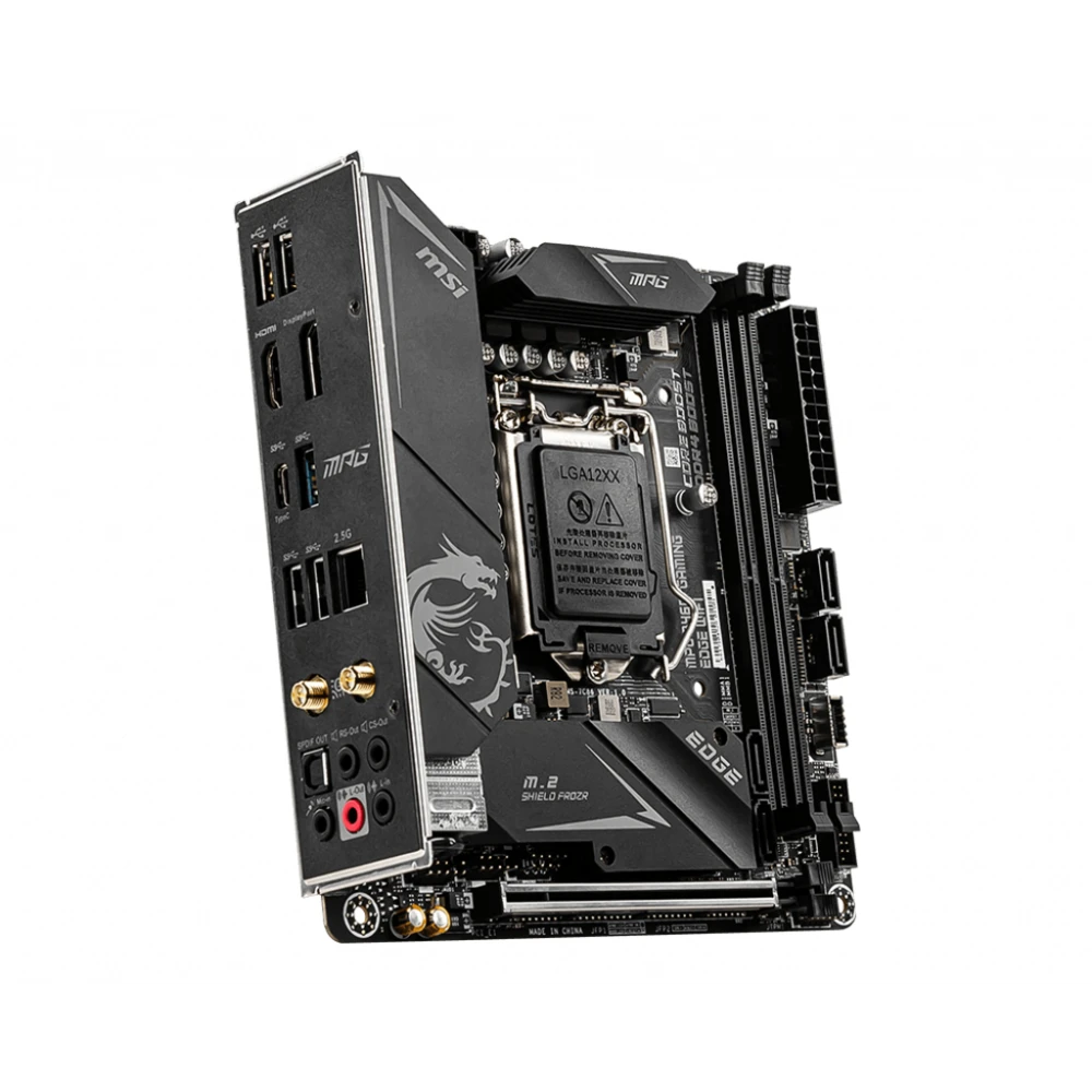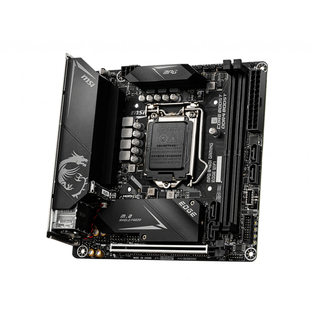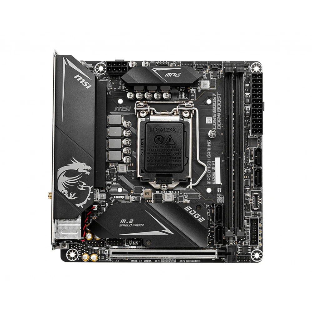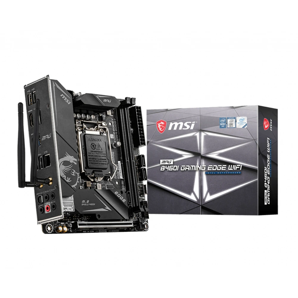 LGA1200, Intel B460, 2x DDR4, HDMI, DP, SATA III, M.2, USB 3.2, 2.5G LAN, Wi-Fi, S/PDIF, Mini-ITX, 170x170 mm MSI MPG B460I GAMING EDGE WIFI. Processor manufacturer: Intel, Processor socket: LGA 1200 (Socket H5), Compatible processor series: Intel® Celeron®, Intel® Core™ i3, Intel® Core™ i5, Intel® Core™ i7, Intel® Core™ i9, Intel® Pentium®. Supported memory types: DDR4-SDRAM, Maximum internal memory: 64 GB, Memory slots type: DIMM. Supported storage drive interfaces: SATA III. Maximum resolution: 4096 x 2304 pixels. Ethernet interface type: 2.5 Gigabit Ethernet, LAN controller: Realtek RTL8125B, Wi-Fi standards: 802.11a, 802.11b, 802.11g, Wi-Fi 4 (802.11n), Wi-Fi 5 (802.11ac), Wi-Fi 6 (802.11ax) GAME IN STYLE