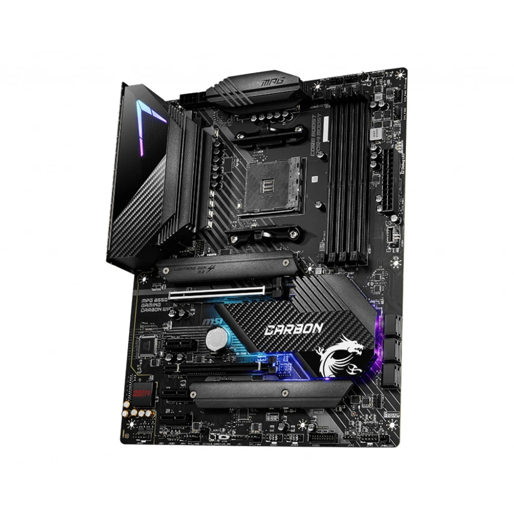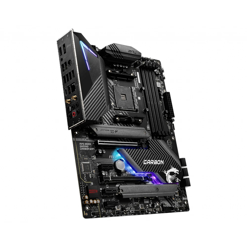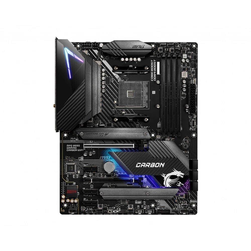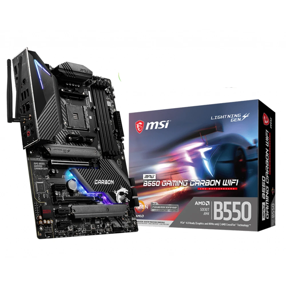 AMD B550, AM4, 4x DDR4 DIMM, HDMI, DP, 2.5G LAN, Wi-Fi, Bluetooth, M.2, SATA III, USB 3.2, S/PDIF, PS/2, ATX, 304x244 mm MSI MPG B550 Gaming Carbon WiFi. Processor manufacturer: AMD, Processor socket: Socket AM4, Compatible processor series: 3rd Generation AMD Ryzen™ 3, 3rd Generation AMD Ryzen 5, 3rd Generation AMD Ryzen™ 7, 3rd.... Supported memory types: DDR4-SDRAM, Maximum internal memory: 128 GB, Memory slots type: DIMM. Supported storage drive interfaces: SATA III, Supported storage drive types: HDD & SSD, RAID levels: 0, 1, 10. Parallel processing technology support: 2-Way CrossFireX, Maximum graphics card memory: 2048 MB, Maximum resolution: 4096 x 2160 pixels. Ethernet interface type: 2.5 Gigabit Ethernet, LAN controller: Realtek RTL8125B, Wi-Fi standards: 802.11a, 802.11b, 802.11g, Wi-Fi 4 (802.11n), Wi-Fi 5 (802.11ac), Wi-Fi 6 (802.11ax) The MPG series brings out the best in gamers by allowing full expression in color with advanced RGB lighting control and synchronization. Experiment on another level of personalization with a front LED strip that provides convenient in-game and real time notifications. With the MPG series, transform your equipment into the center of attention and top leaderboards in style.