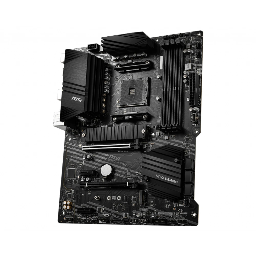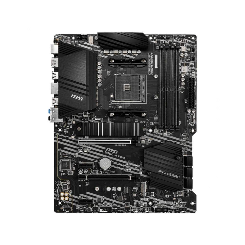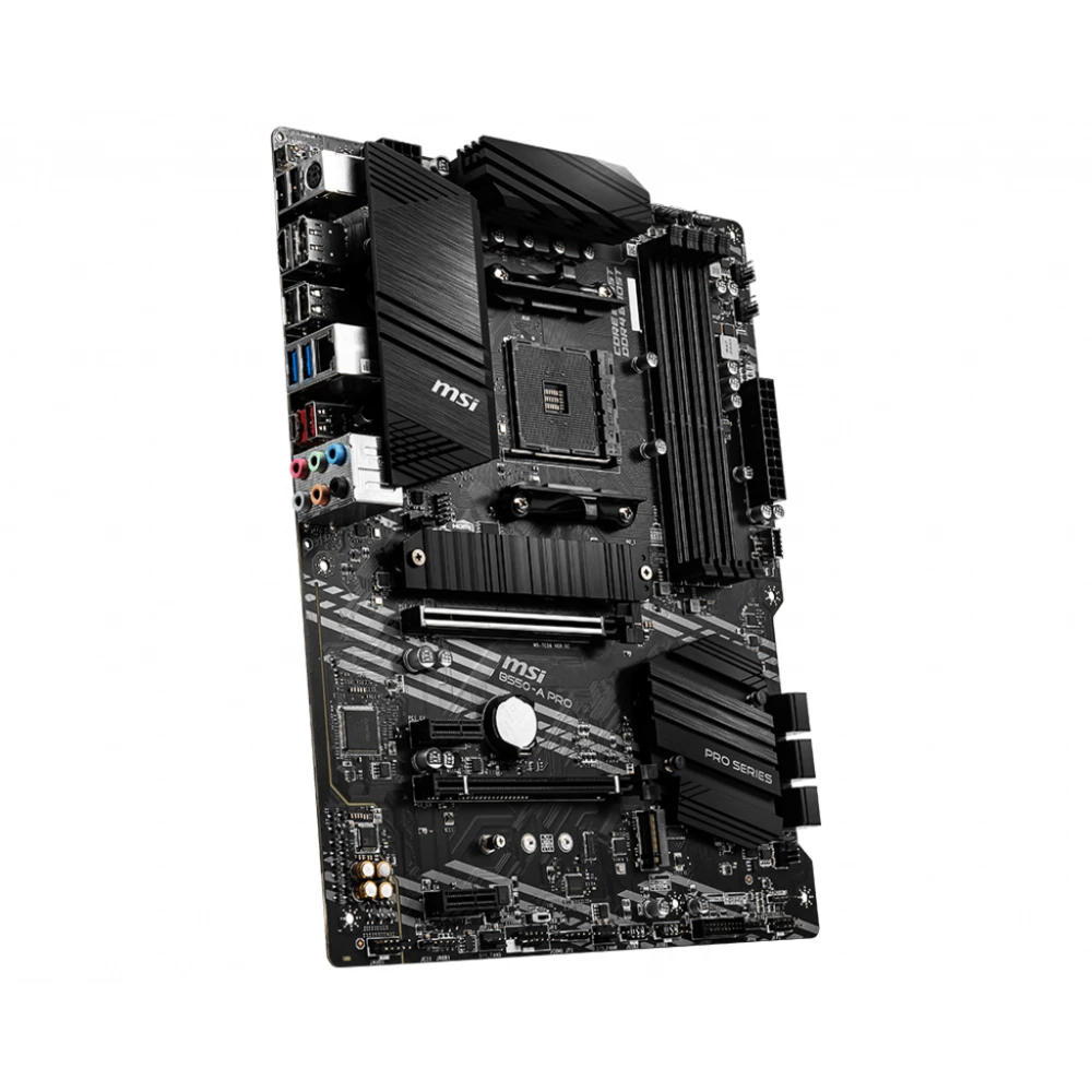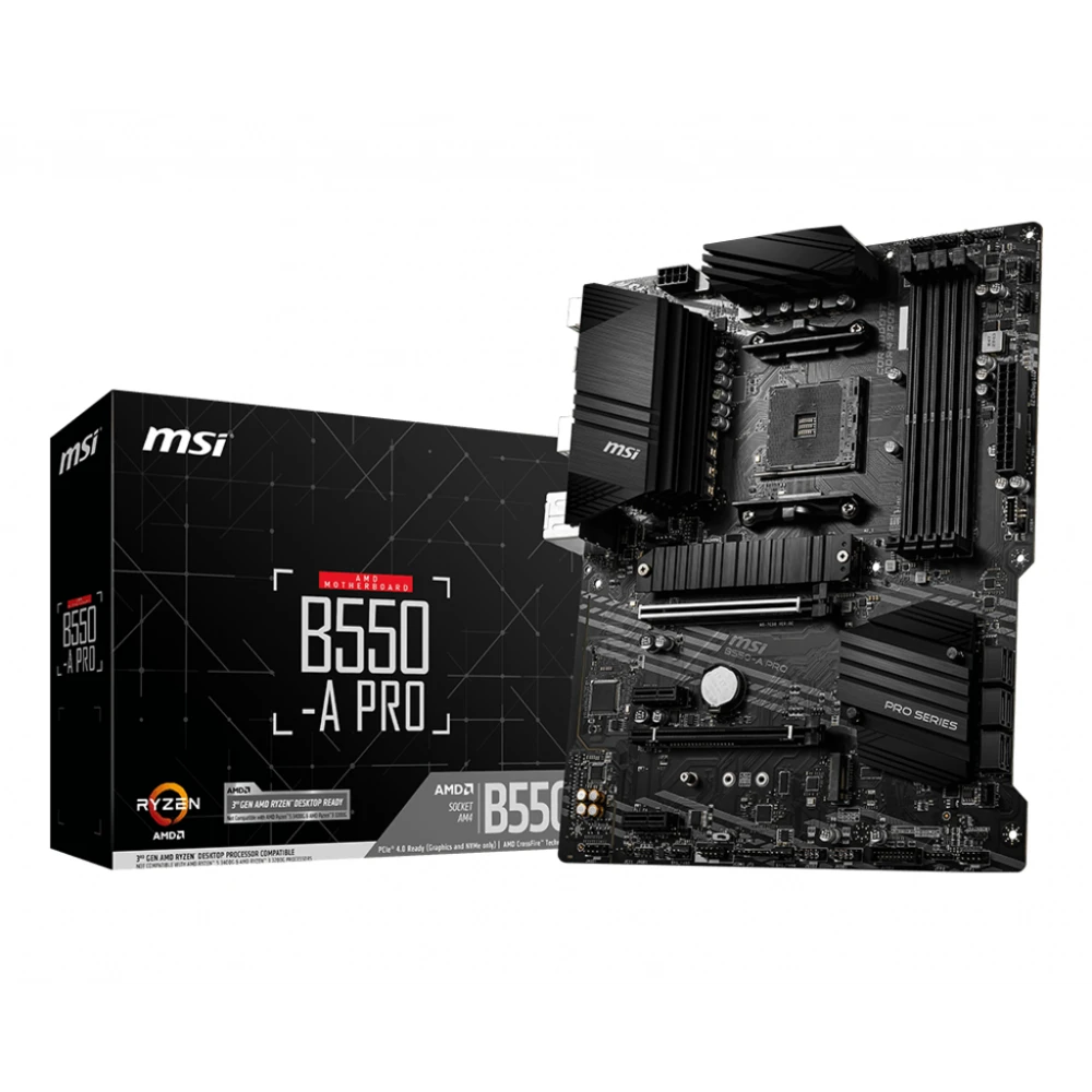 AMD B550, AM4, 4x DDR4, HDMI, DP, SATA III, M.2, USB 3.2, 1G LAN, PS/2, ATX, 305x244 mm MSI B550-A PRO. Processor manufacturer: AMD, Processor socket: Socket AM4, Compatible processor series: 3rd Generation AMD Ryzen™ 3, 3rd Generation AMD Ryzen 5, 3rd Generation AMD Ryzen™ 7, 3rd.... Supported memory types: DDR4-SDRAM, Maximum internal memory: 128 GB, Memory slots type: DIMM. Supported storage drive interfaces: SATA III, Supported storage drive types: HDD & SSD, RAID levels: 0, 1, 10. Parallel processing technology support: 2-Way CrossFireX, Maximum graphics card memory: 16000 MB, Maximum resolution: 4096 x 2160 pixels. Ethernet interface type: Gigabit Ethernet, LAN controller: Realtek 8111H PRO series helps users work smarter by delivering an efficient and productive experience. Featuring stable functionality and high-quality assembly, PRO series motherboards provide not only optimized professional workflows but also less troubleshooting and longevity. PRO series helps users work smarter by delivering an efficient and productive experience. Featuring stable functionality and high-quality assembly, PRO series motherboards provide not only optimized professional workflows but also less troubleshooting and longevity.