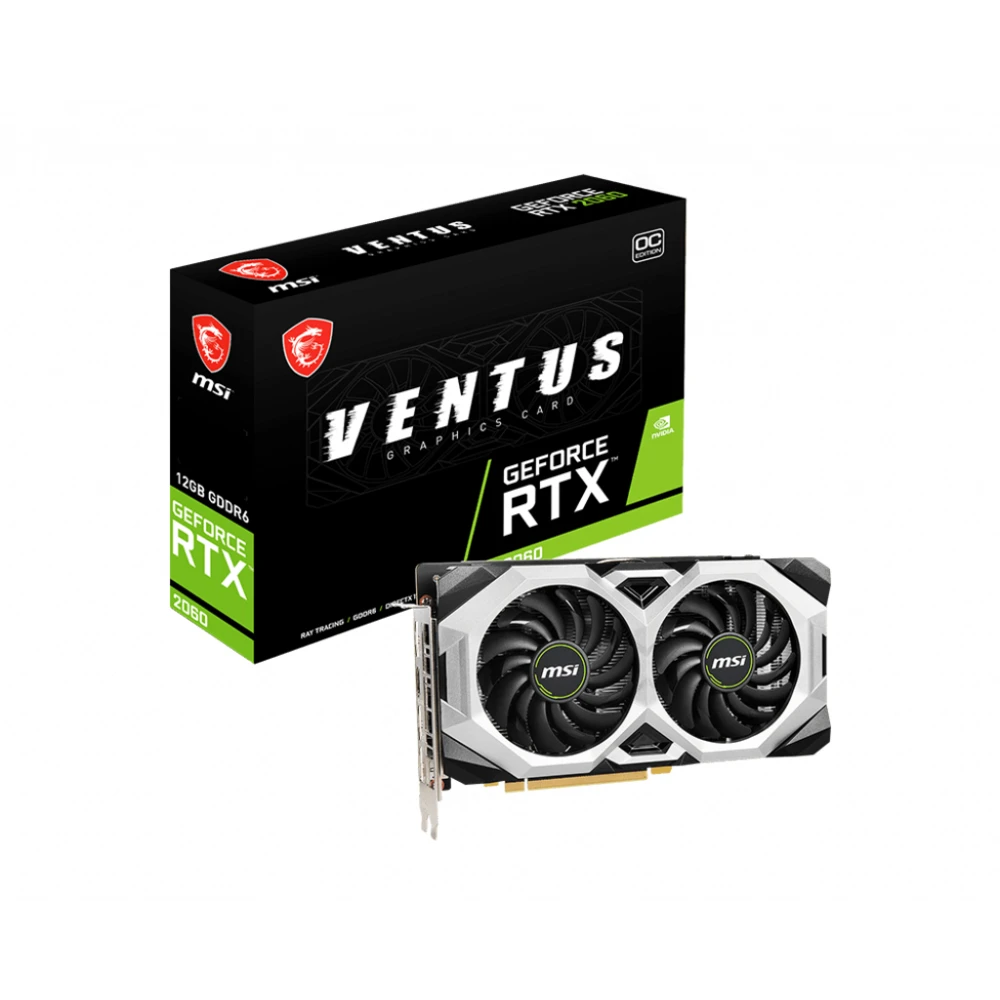 MSI VENTUS GeForce RTX 2060 12G OC. Graphics processor family: NVIDIA, Graphics processor: GeForce RTX 2060. Discrete graphics card memory: 12 GB, Graphics card memory type: GDDR6, Memory bus: 192 bit. Maximum resolution: 7680 x 4320 pixels. DirectX version: 12.0, OpenGL version: 4.6. Interface type: PCI Express x16 3.0. Cooling type: Active, Number of fans: 2 fan(s)