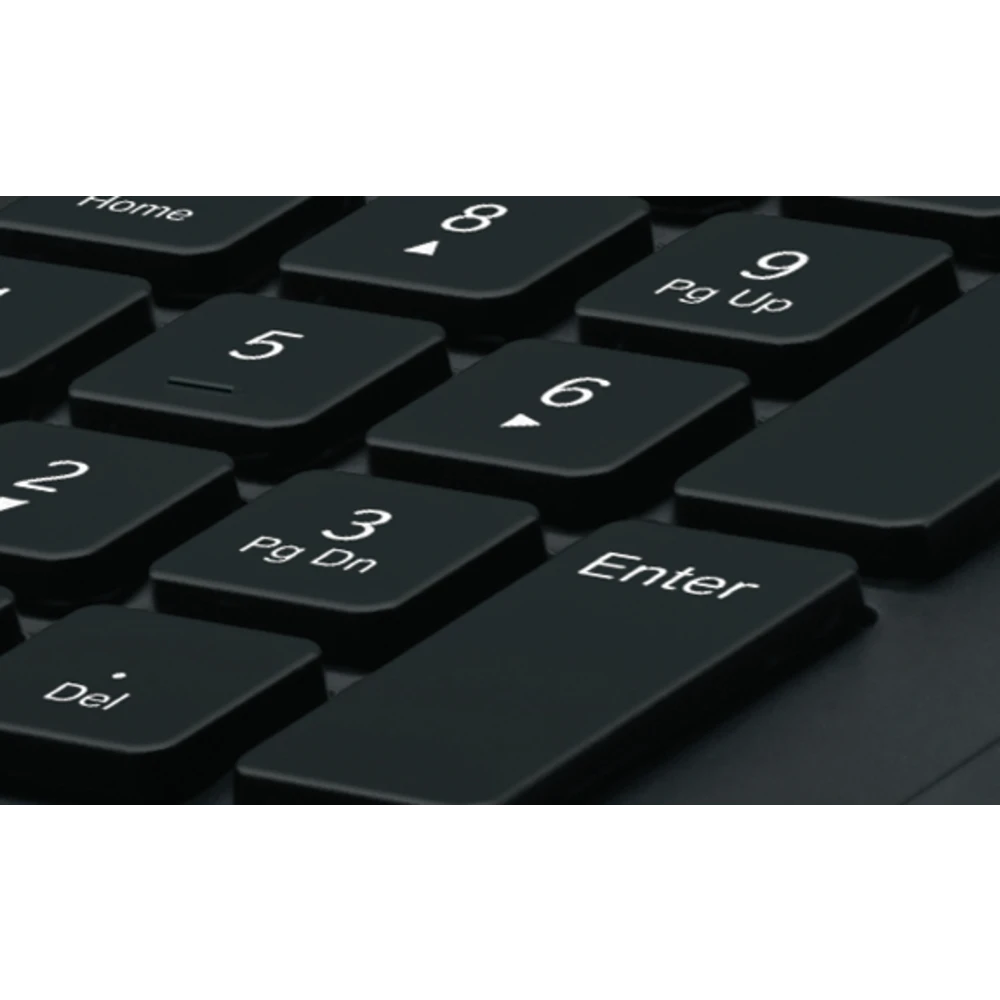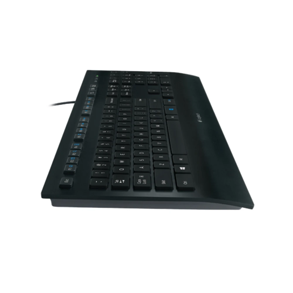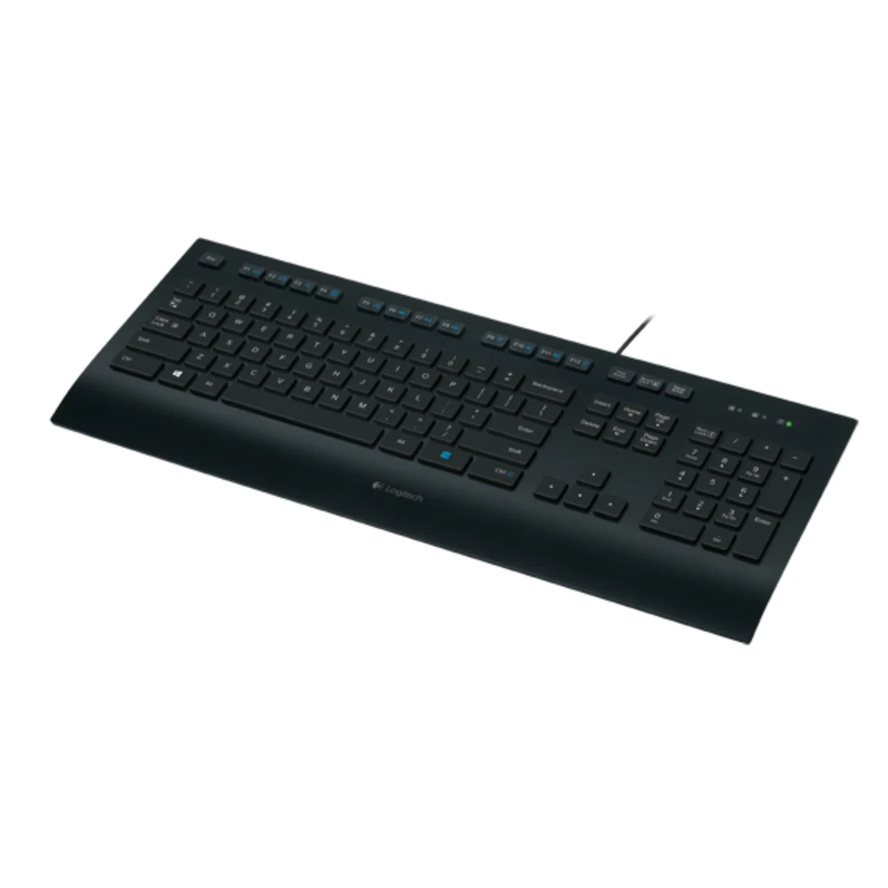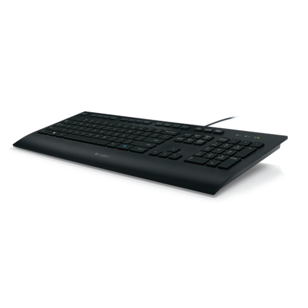 Keyboard K280e for Business Logitech Keyboard K280e for Business. Keyboard form factor: Full-size (100%). Keyboard style: Straight. Connectivity technology: Wired, Device interface: USB, Keyboard layout: QWERTY. Wrist rest. Recommended usage: Office. Product colour: Black The Logitech Corded Keyboard K280e provides businesses quality and value with a durable and comfortable design that can handle years of heavy office use. The Logitech Corded Keyboard K280e provides businesses the perfect balance of quality and value. With a reinforced chassis, sturdy tilt legs, and spill-resistant structure, the enterprise-grade K280e keyboard is built for years of heavy office use. The low-profile, nearly-silent keys are designed to withstand up to 10 million keystrokes and are printed with padded printing and a UV coating that prevents the letters and numbers from wearing down over time. A full-size palm rest and smooth-typing key action make this sleek, modern keyboard comfortable for all-day use and a favorite among your workforce as well.