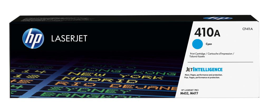 410A Cyan Original LaserJet Toner Cartridge HP 410A Cyan Original LaserJet Toner Cartridge. Colour toner page yield: 2300 pages, Printing colours: Cyan, Quantity per pack: 1 pc(s) HP 410A LaserJet Toner Cartridge, cyan, 2,300 pages.[4] Ideal for producing professional-quality colour prints at high speeds your HP printer or MFP was built for, while helping protect against fraud.