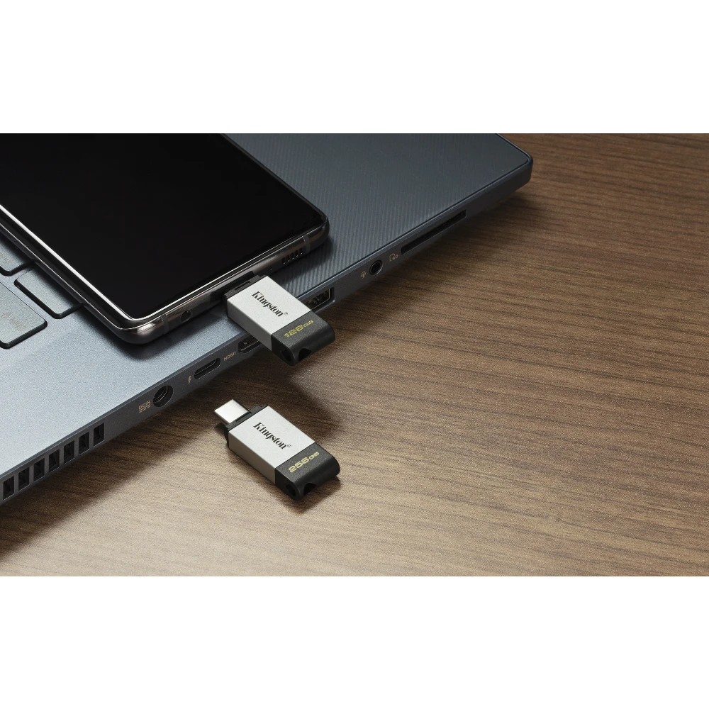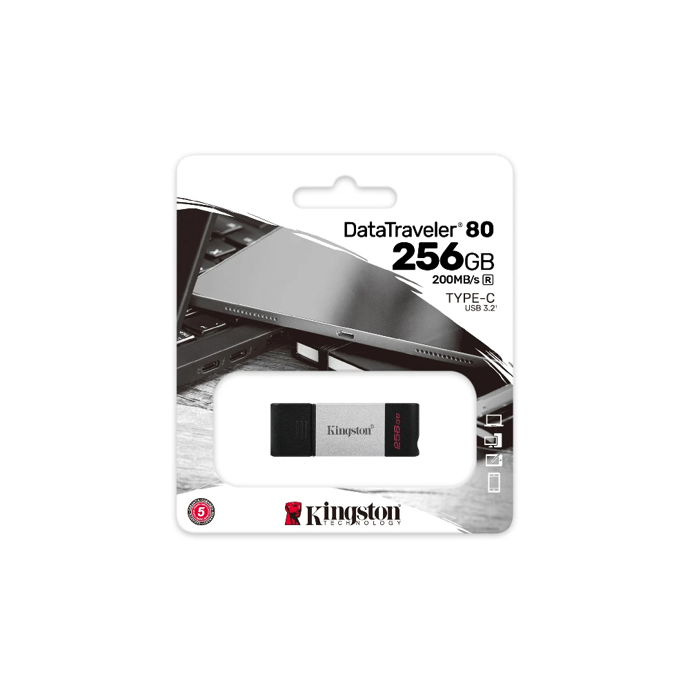 Kingston Technology DataTraveler 80. Capacity: 256 GB, Device interface: USB Type-C, USB version: 3.2 Gen 1 (3.1 Gen 1), Read speed: 200 MB/s, Write speed: 60 MB/s. Form factor: Cap. Weight: 4.134 g. Product colour: Black, Silver