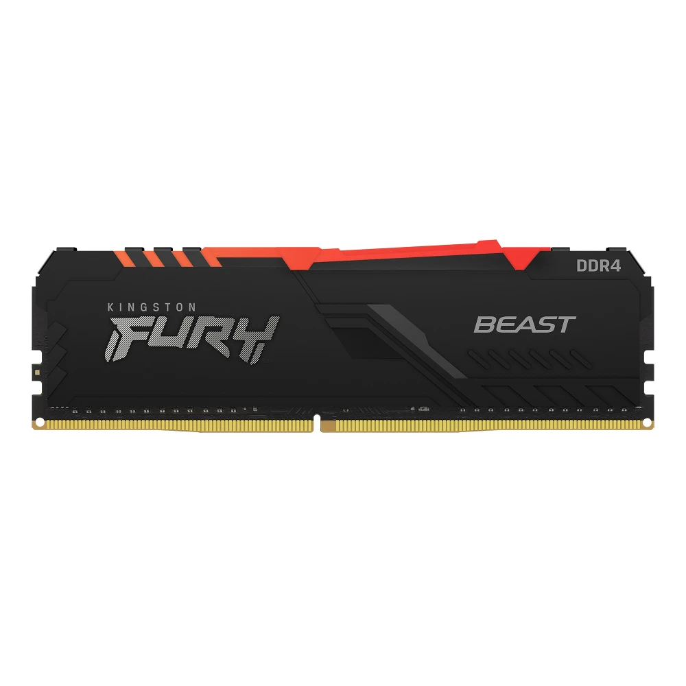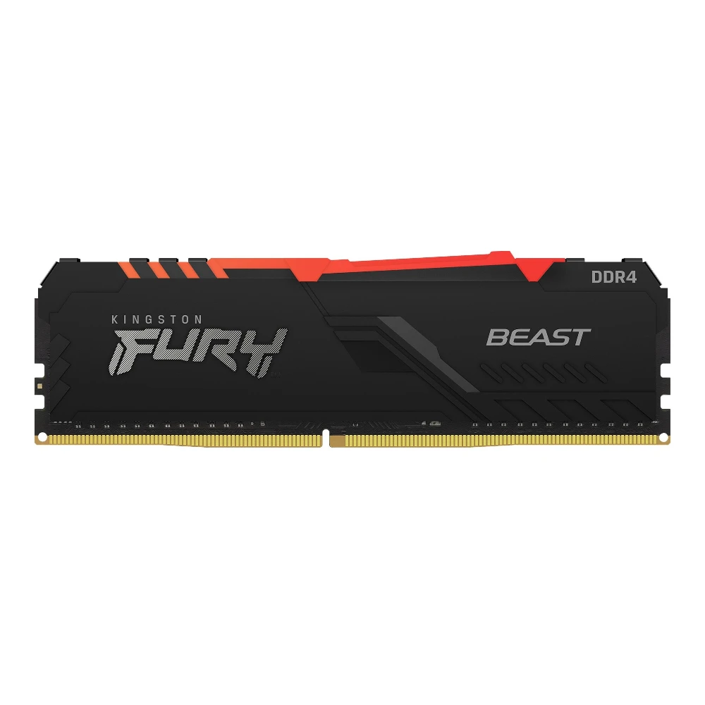 Kingston FURY™ Beast DDR4 RGB1 delivers a boost of performance and style with speeds of up to 3733MHz2, aggressive styling, and RGB lighting that runs the length of the module for smooth and stunning effects. This dazzling, cost-effective upgrade is available in 2666MHz–3733MHz speeds, CL15–19 latencies, single module capacities of 8GB–32GB, and kit capacities of 16GB–128GB. It features Plug N Play automatic overclocking at 2666MHz2 speeds and is both Intel XMP-ready and ready for Ryzen. FURY Beast DDR4 RGB stays cool with its stylish, low-profile heat spreader.
