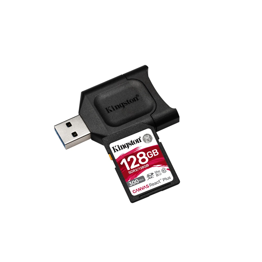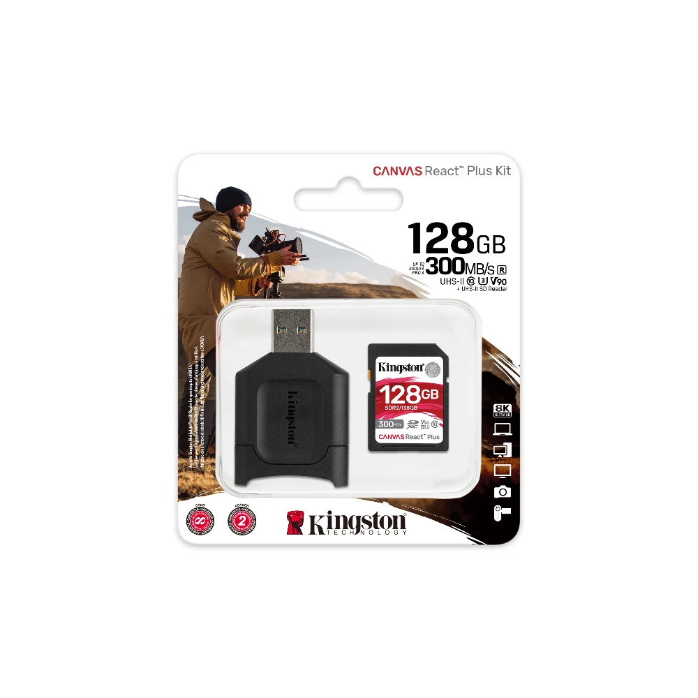 128GB, Class 10, UHS-II, U3, V90 Kingston Technology Canvas React Plus. Capacity: 128 GB, Flash card type: SD, Flash memory class: Class 10, Internal memory type: UHS-II, Read speed: 300 MB/s, Write speed: 260 MB/s, UHS Speed Class: Class 3 (U3), Video Speed Class: V90. Product colour: Black Creativity and Inspiration in Professional Quality