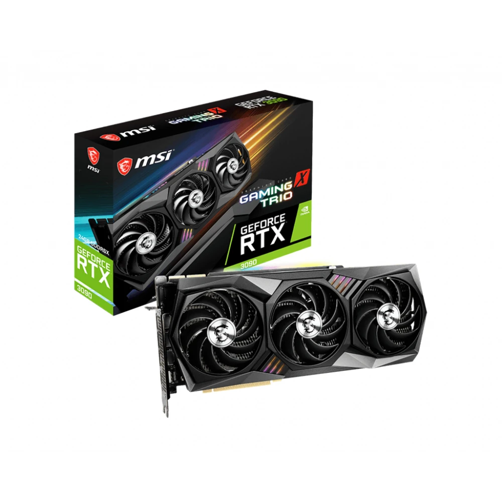 MSI GAMING RTX 3090 X TRIO 24G. Graphics processor family: NVIDIA, Graphics processor: GeForce RTX 3090. Discrete graphics card memory: 24 GB, Graphics card memory type: GDDR6X, Memory bus: 384 bit. Maximum resolution: 7680 x 4320 pixels. DirectX version: 12.0, OpenGL version: 4.6. Interface type: PCI Express x16 4.0. Cooling type: Active, Number of fans: 3 fan(s), Illumination colour: Multi