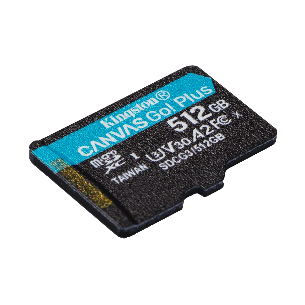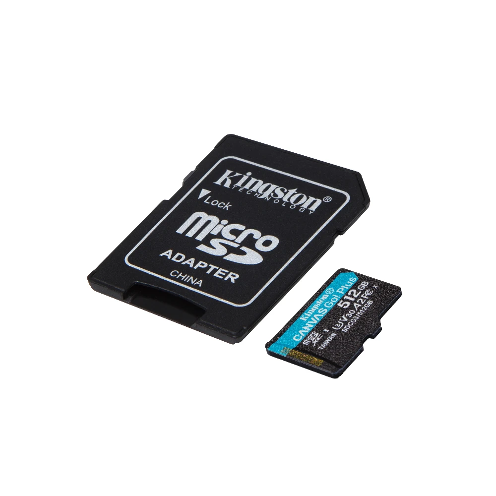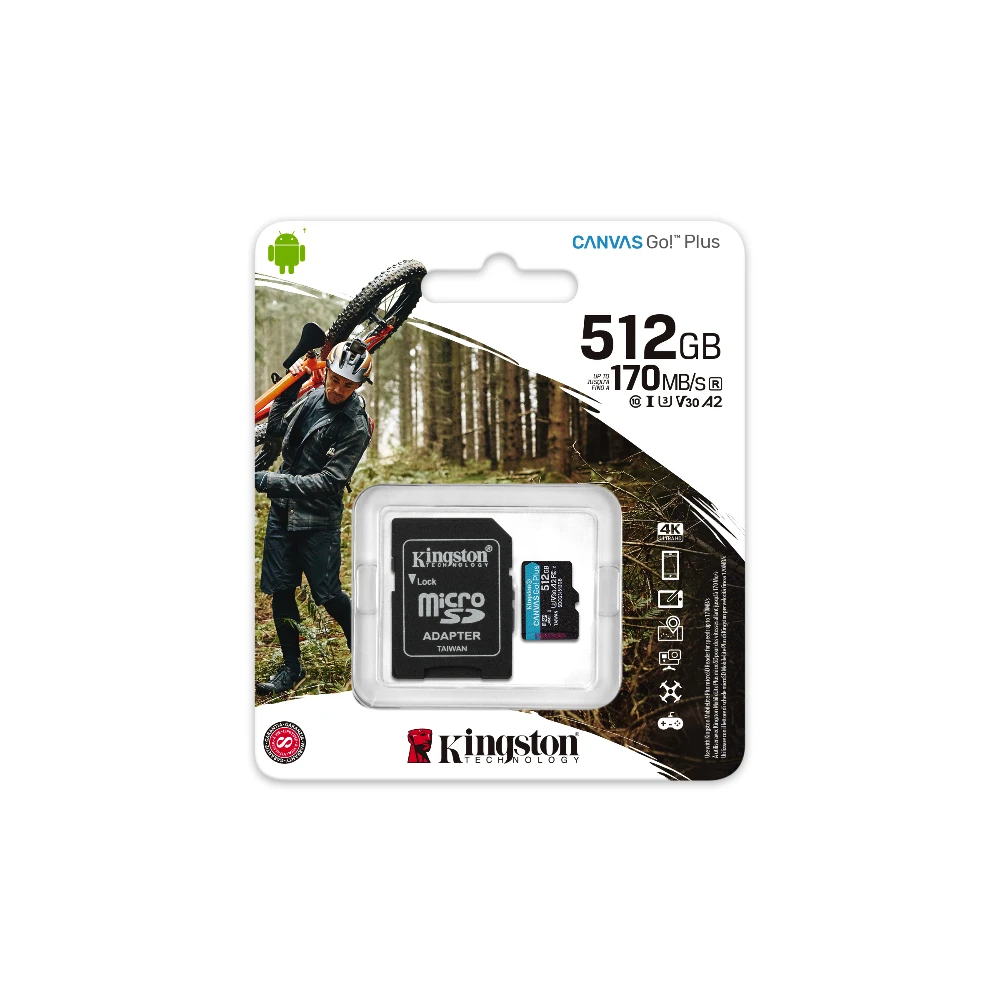 Kingston Technology 512GB microSDXC Canvas Go Plus 170R A2 U3 V30 Card + ADP. Capacity: 512 GB, Flash card type: MicroSD, Flash memory class: Class 10, Internal memory type: UHS-I, Read speed: 170 MB/s, Write speed: 90 MB/s, UHS Speed Class: Class 3 (U3), Video Speed Class: V30. Protection features: Shock resistant, Temperature proof, Vibration proof, Waterproof, X-ray proof, Product colour: Black