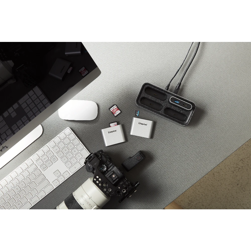 Kingston’s Workflow Station and Readers provide a flexible system to transfer video, photos and audio from multiple sources at once.* Expedite your post-production workflow and create a file offload setup that fits your needs. The Workflow Station Dock is customisable so you can use only the USB miniHub, SD readers or microSD readers that your shoot requires. Whether you’re on a 4K/8K multi-cam shoot with portable audio recorders for each host, or filming B-Roll with drones and GoPros, you can connect up to four readers to the dock simultaneously and transfer footage quickly. The Workflow Station and Readers support USB 3.2 speeds, which get you to your post-production process faster than ever. For added flexibility, the card readers can be used on the go. When you need to shoot on location, simply drop the hub or readers you need into your bag and connect them to your laptop using the included USB cable.