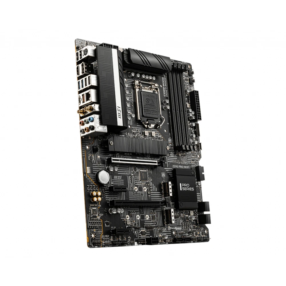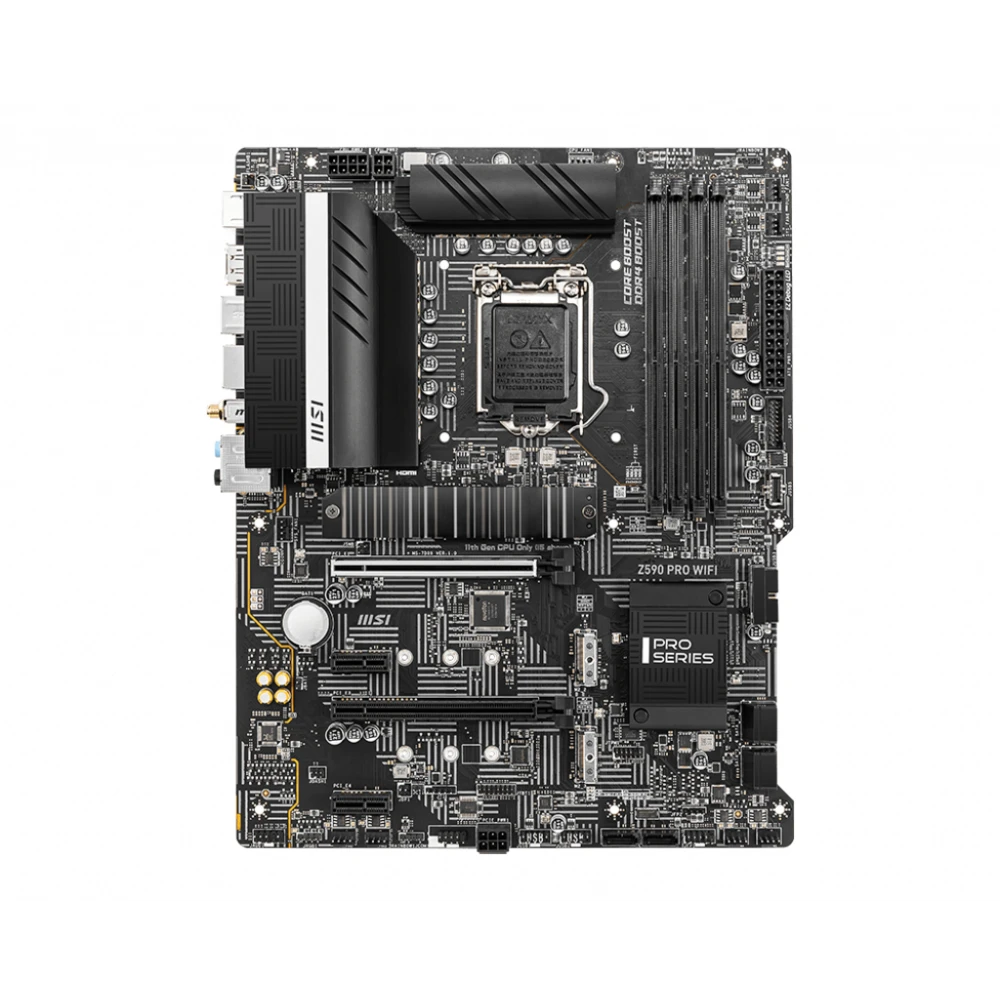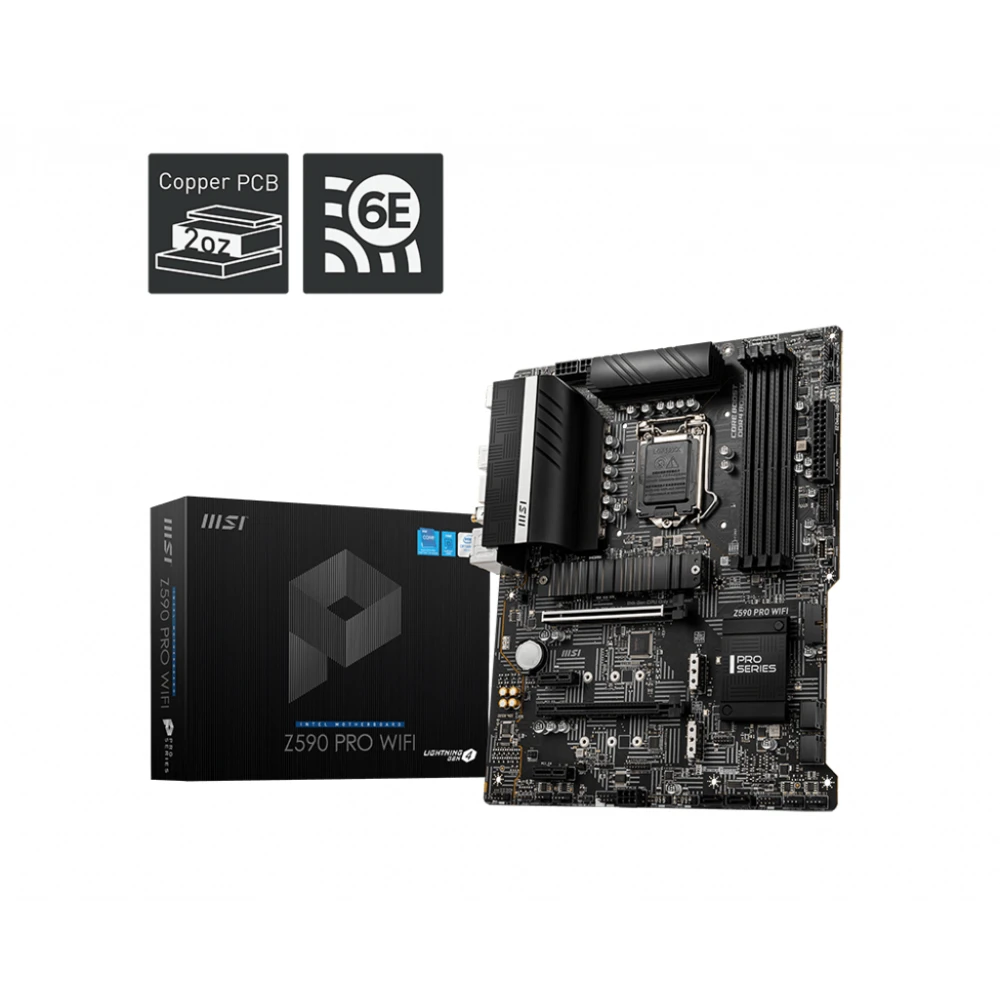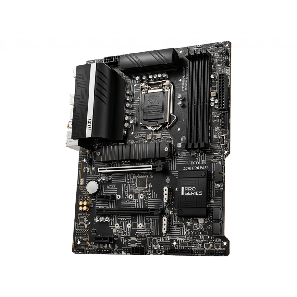 LGA 1200, ATX, DDR4-SDRAM, 4x DIMM, 128 GB, non-ECC, Unbuffered, M.2,Serial ATA, RAID 0/1/5/10 MSI Z590 PRO WIFI. Processor manufacturer: Intel, Processor socket: LGA 1200 (Socket H5), Compatible processor series: Intel® Celeron®, Intel® Core™ i9, Intel Pentium G. Supported memory types: DDR4-SDRAM, Maximum internal memory: 128 GB, Memory slots type: DIMM. Supported storage drive interfaces: M.2, SATA, Supported storage drive types: HDD & SSD, RAID levels: 0, 1, 5, 10. Parallel processing technology support: Crossfire, Graphics card family: AMD. HDMI version: 2.0b PRO series helps users work smarter by delivering an efficient and productive experience. Featuring stable functionality and high-quality assembly, PRO series motherboards provide not only optimized professional workflows but also less troubleshooting and longevity.