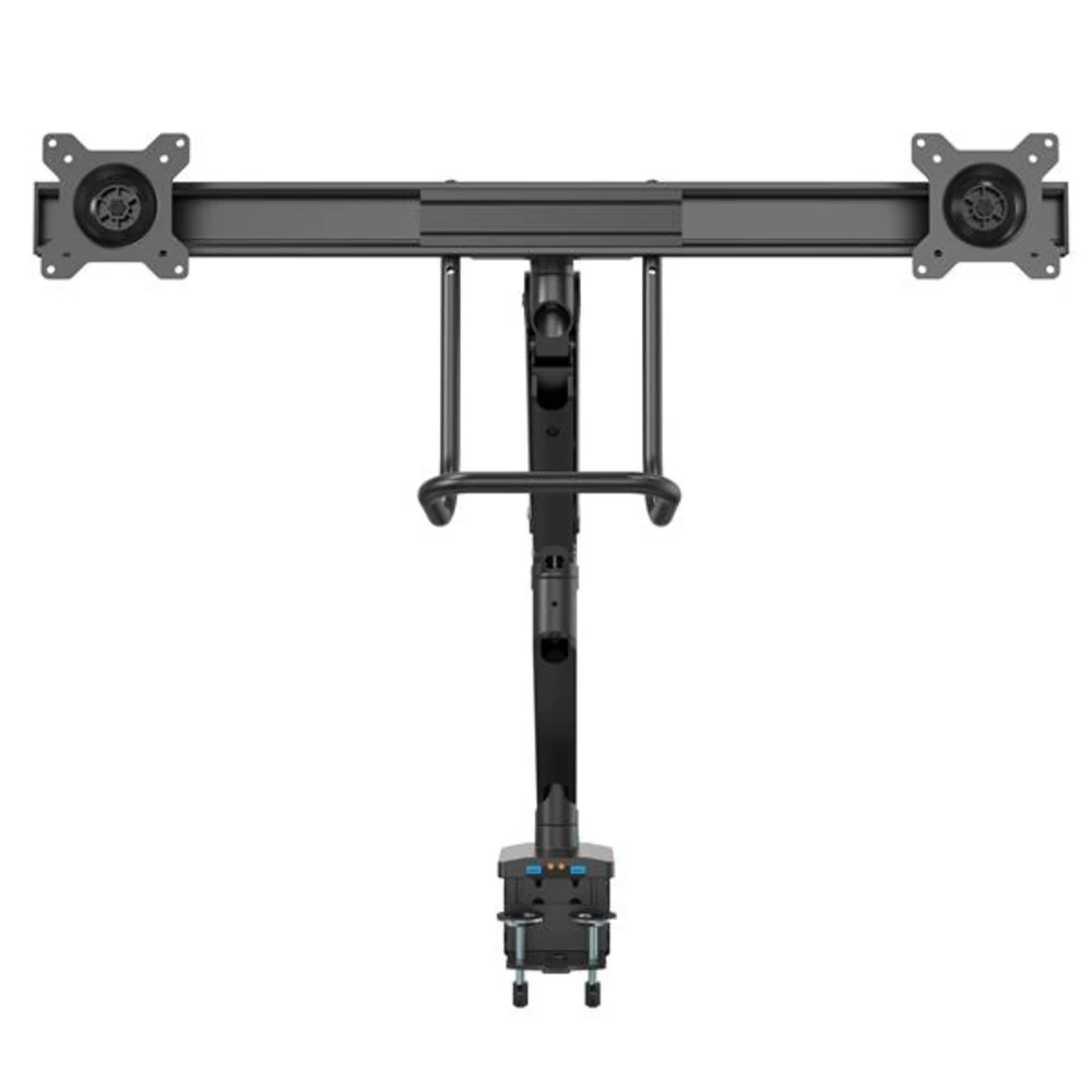 - VESA 75x75/100x100mm heavy duty slim monitor mount supports displays up to 32" (17.6 lb) - 2x USB-A 3.0 5Gbps passthrough ports | 2x 3.5mm audio/mic jacks - Ergonomic desk mount dual monitor arm w/ individual +/-10° tilt | +/-10° swivel | 360° rotating arm| sliding horizontal crossbar to align screens - Max height of 23.4" from desk | Full motion arm adjustable height w/ range of 13" and can extend outwards up to 23" | Handle for synchronized motion - C-clamp/grommet mount to desk (10mm-48mm)