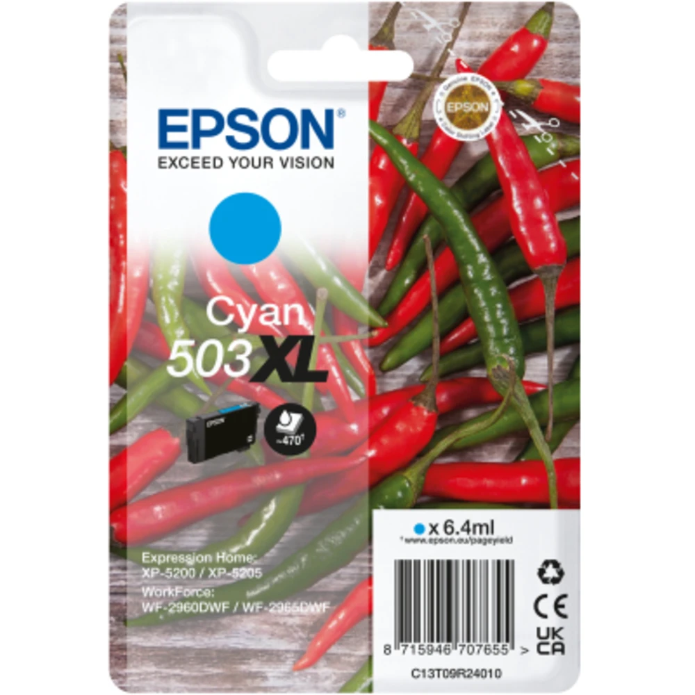 Singlepack Cyan 503XL Ink Epson 503XL. Cartridge capacity: High (XL) Yield, Supply type: Single pack, Colour ink volume: 6.4 ml, Quantity per pack: 1 pc(s) Providing a low-cost yet reliable printing solution, this affordable four-colour ink benefits from Epson?s extensive research and development. Producing clear and vibrant prints, the 503 ink is optimised to work with Epson?s range of printers. It can produce an array of documents with defined text and graphics.