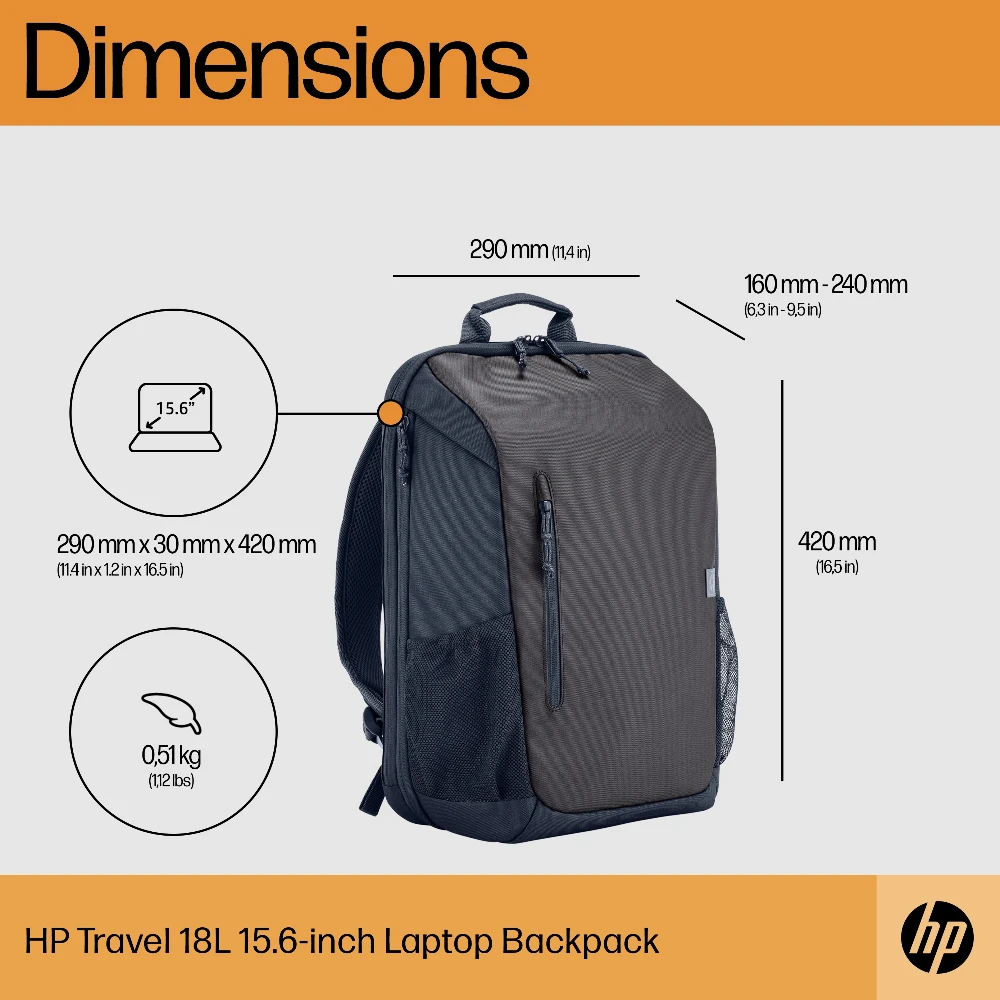 HP Travel 18 Liter 15.6 Iron Grey Laptop Backpack. Backpack type: Travel backpack, Product main colour: Blue, Grey, Maximum screen size: 39.6 cm (15.6"). Width: 290 mm, Depth: 240 mm, Height: 420 mm. Package width: 290 mm, Package depth: 160 mm, Package height: 420 mm. Material: Polyester