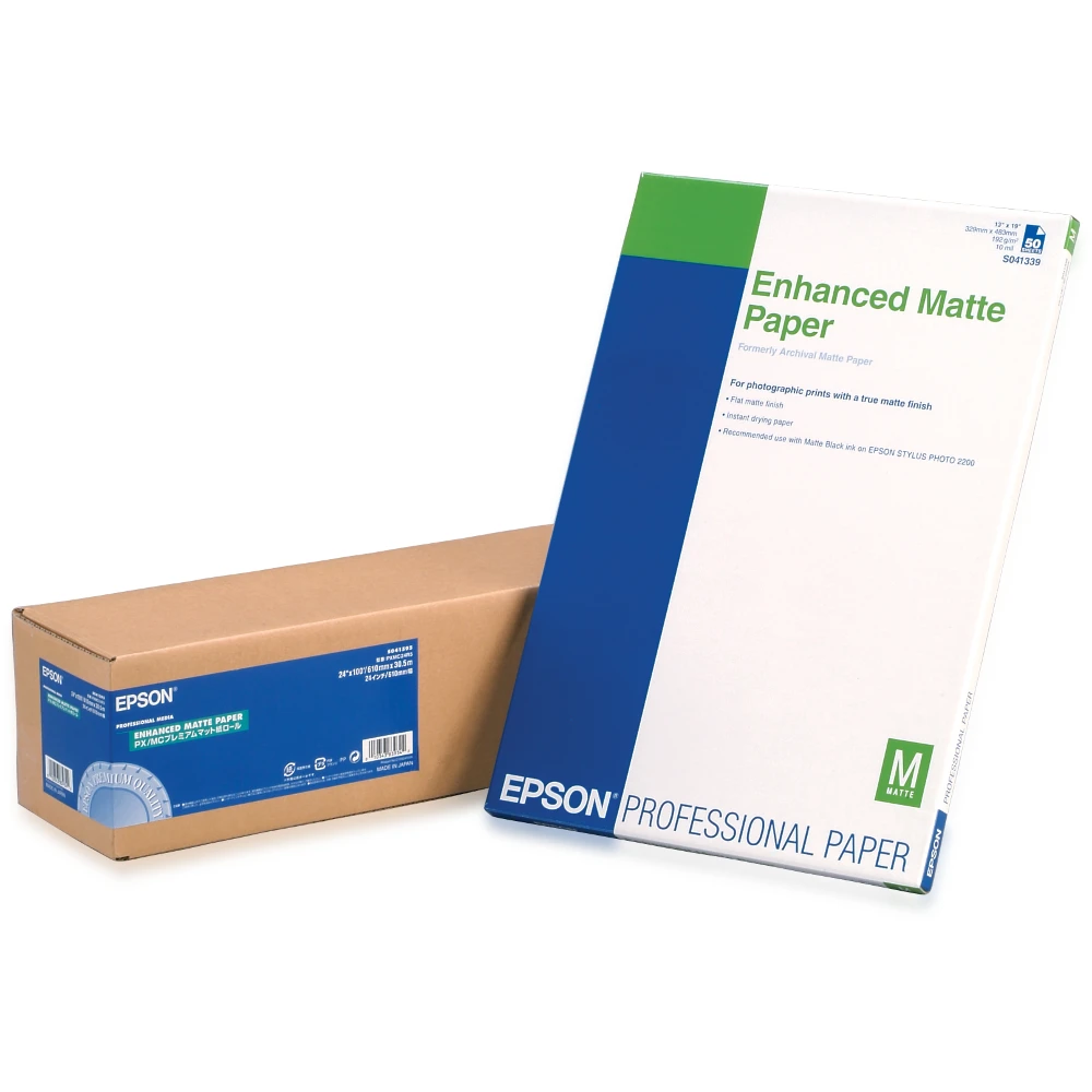For photographers requiring a flat matte surface, Epson Enhanced Matte Paper is the ideal choice. This bright white paper is perfect for images that do not require gloss. It produces highly saturated images, while maintaining excellent highlight and shadow detail. Designed primarily for use with Epson UltraChrome and DuraBrite Inks, this versatile paper can also be used with dye-based inks. Hobbyists, professional photographers and digital artists alike will find Epson Enhanced Matte Paper a remarkable media solution for any project.