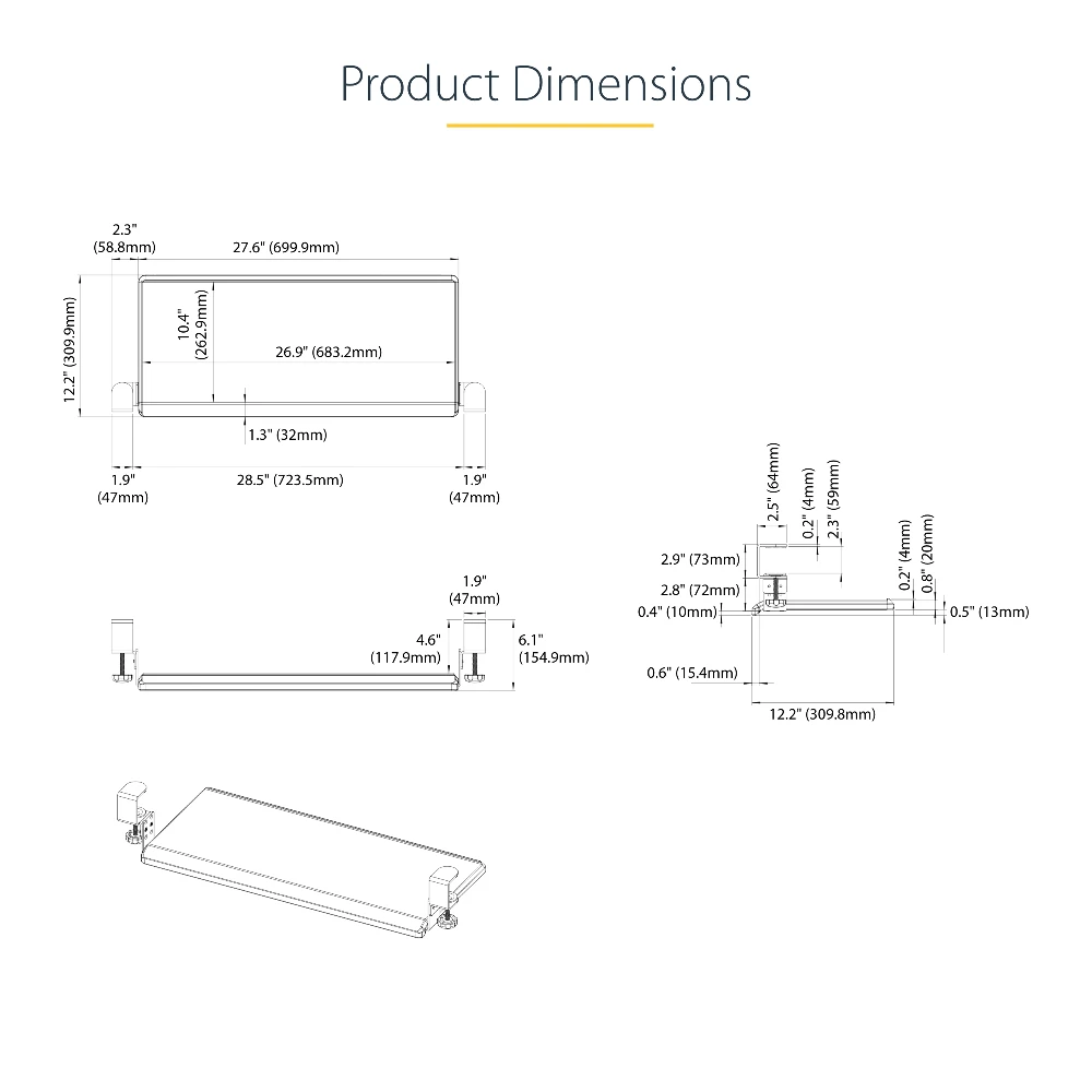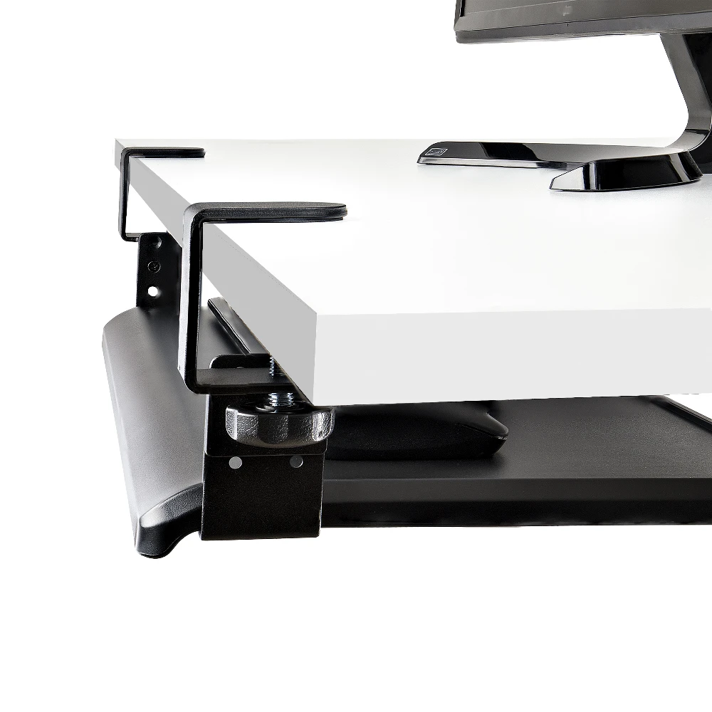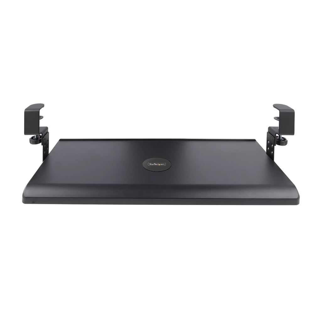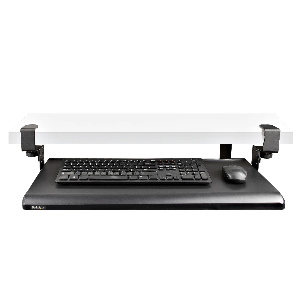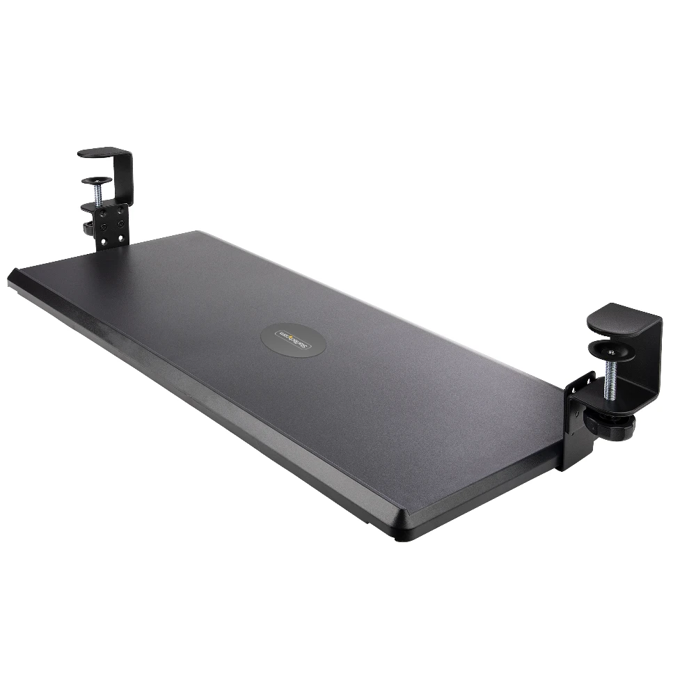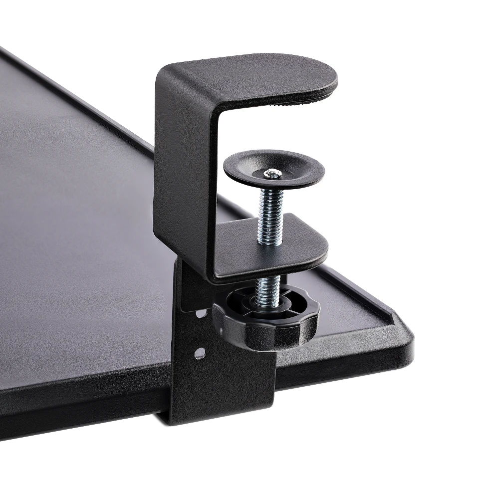- The sliding keyboard tray offers 3 heights (3.9/4.7/5.5") between the desk and the tray. The black clamp-on keyboard tray area of 27.5x12.2" supports up to 26.5lb - The keyboard drawer is easily secured with desk clamps equipped with anti-slip pads for stability and to protect the desk surface - The under-desk keyboard tray features sliding rails. The front of the keyboard and mouse tray extends up to 8.5" from the edge of the desk - The keyboard pull out tray is curved for wrist comfort