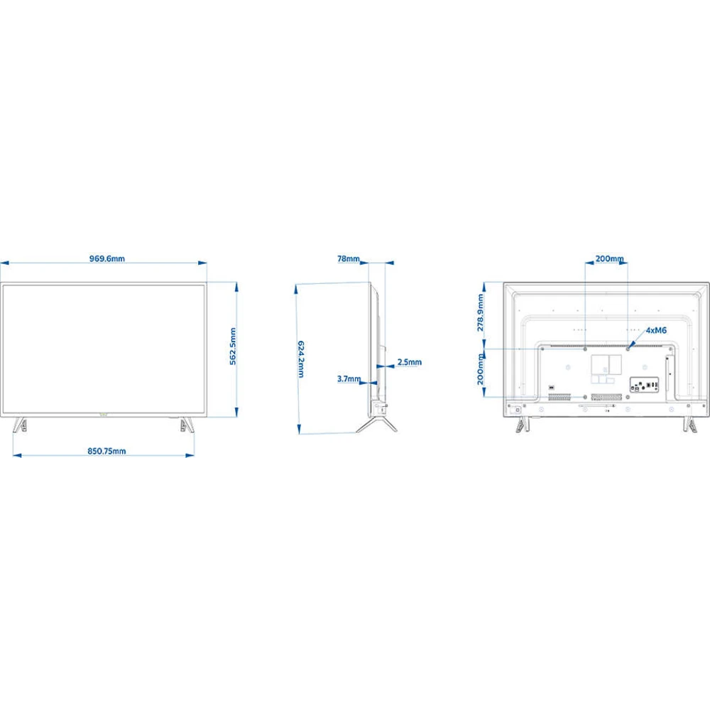 43", 1920 x 1080p, 250 cd/m?, RMS 20 (2x10) W, 802.11 ac, RJ-45, 2x HDMI, USB 2.0, CI+ 1.3.2, VESA 200x200mm