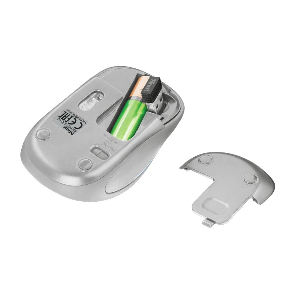 Trust Yvi FX. Form factor: Ambidextrous. Movement detection technology: Optical, Device interface: RF Wireless, Movement resolution: 1600 DPI, Buttons type: Pressed buttons, Buttons quantity: 4, Scroll type: Wheel. Illumination colour: Multi. Power source: Batteries. Product colour: Grey, White