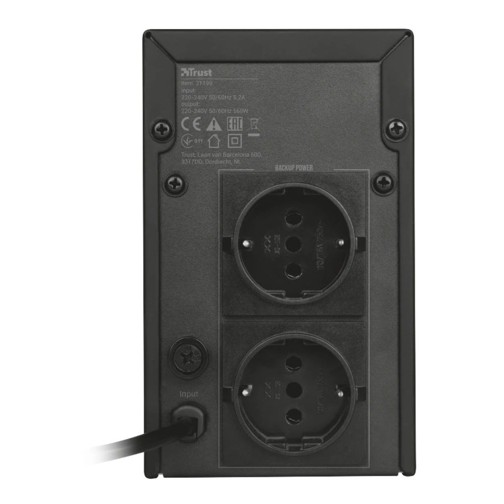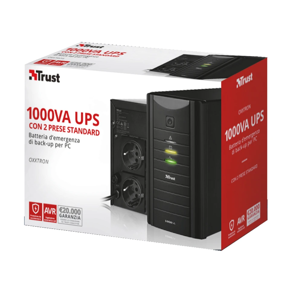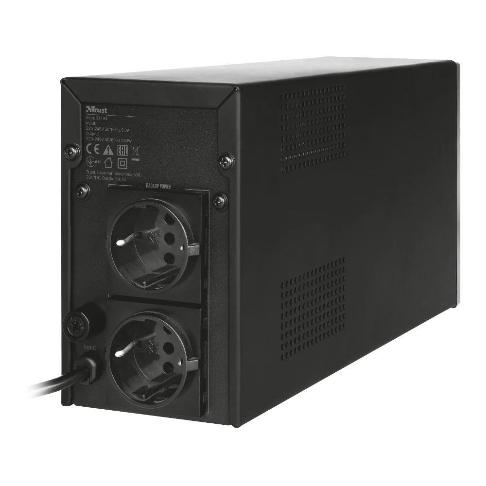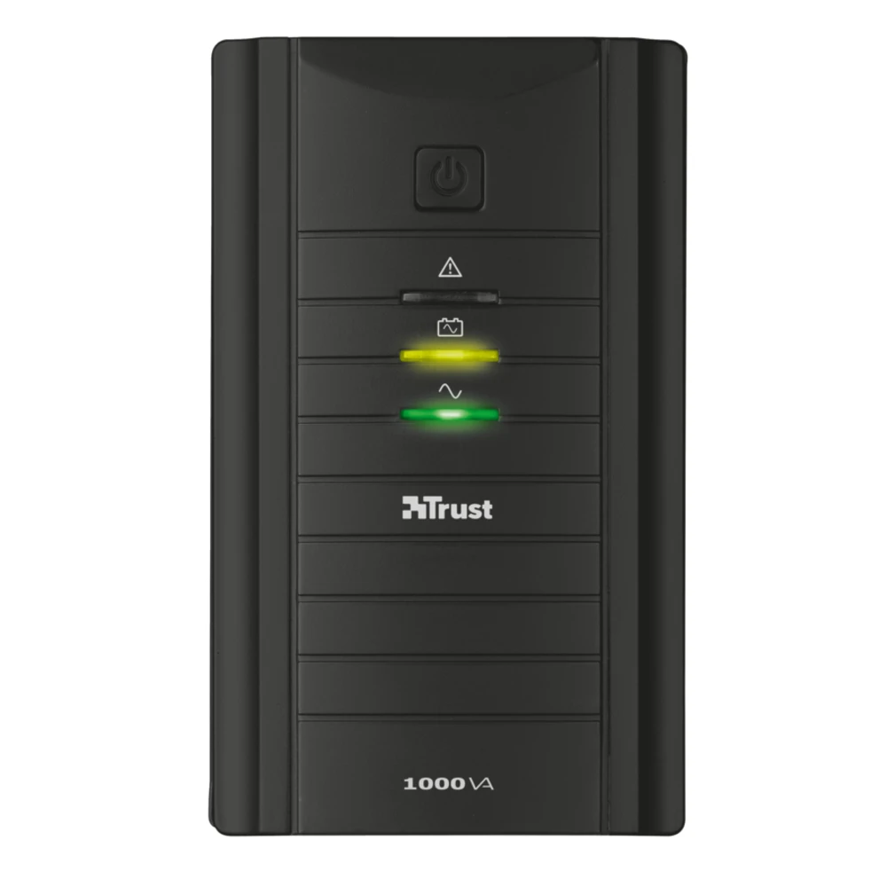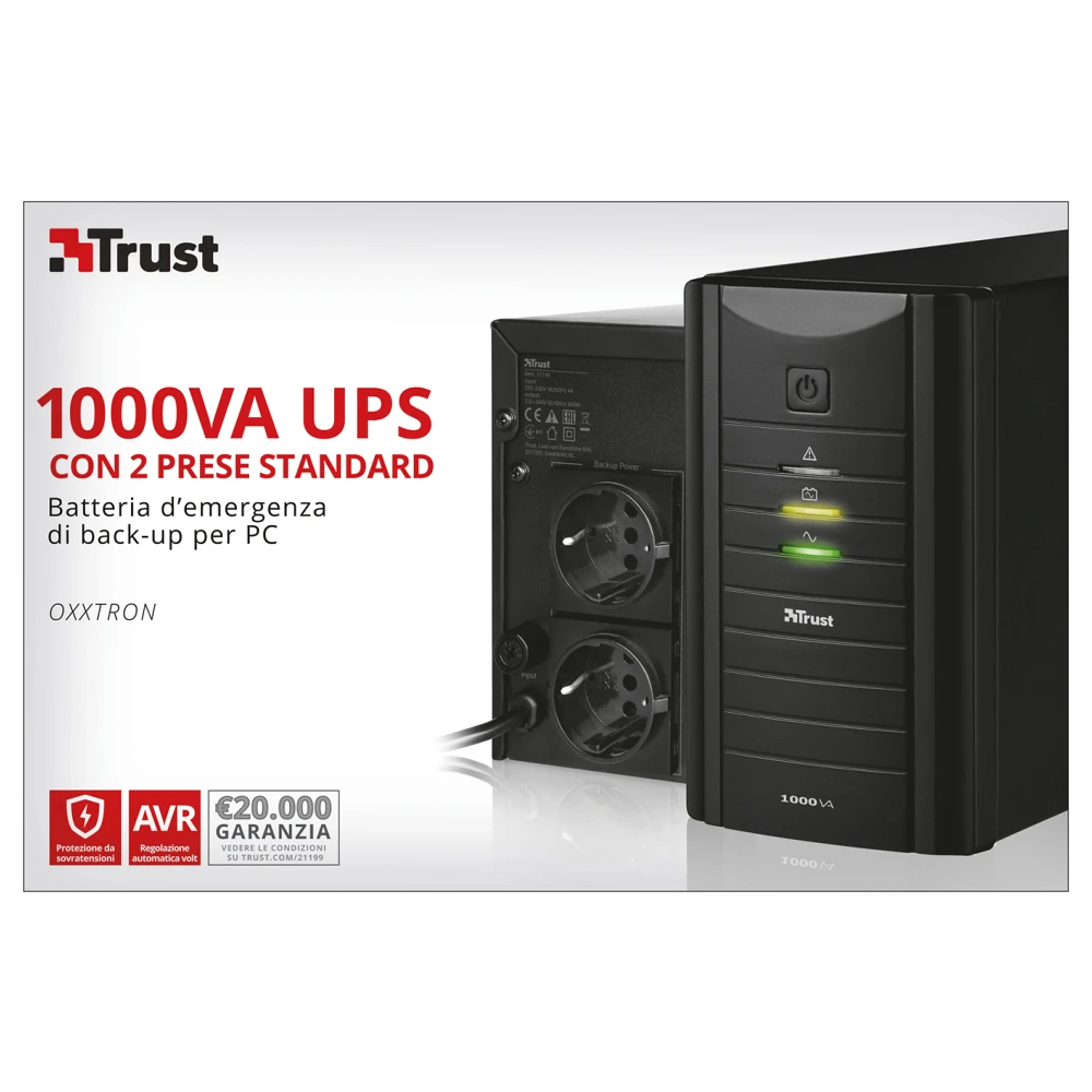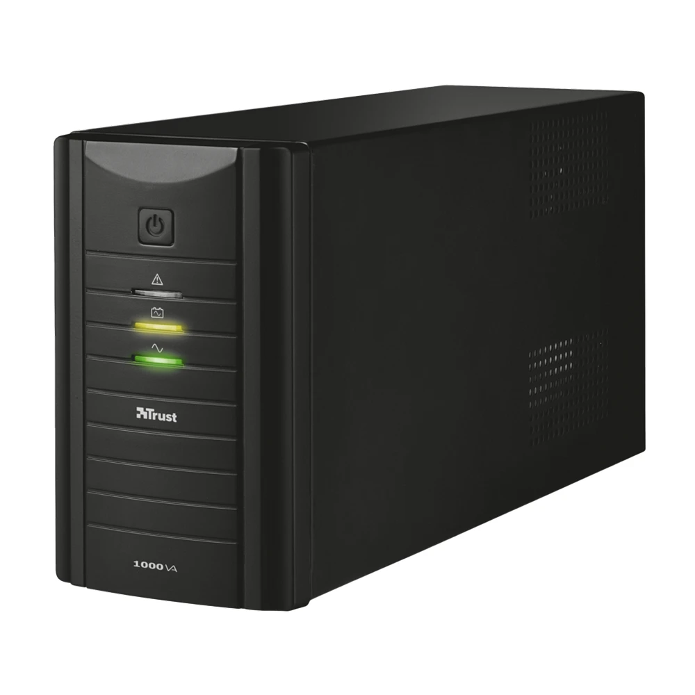 1000VA, 2x Schuko, 12V/9Ah, LED Trust Oxxtron 1000VA. Output power capacity: 1 kVA, Waveform: Sine, Input operation voltage (min): 81 V. AC outlets quantity: 2 AC outlet(s). Battery technology: Sealed Lead Acid (VRLA), Battery capacity: 9 Ah, Battery voltage: 12 V. Form factor: Mini Tower, Product colour: Black, Housing material: Metal. Width: 96 mm, Depth: 320 mm, Height: 160 mm Compact, reliable 1000VA battery back-up UPS with 2 surge-protected wall power outlets (Schuko)